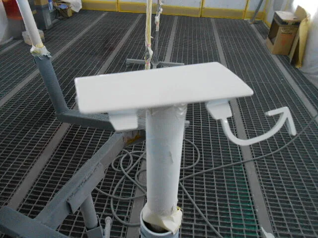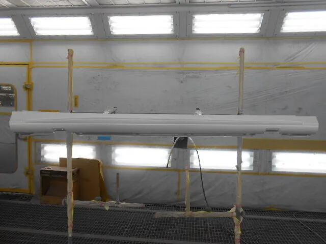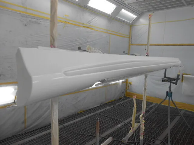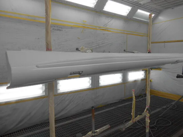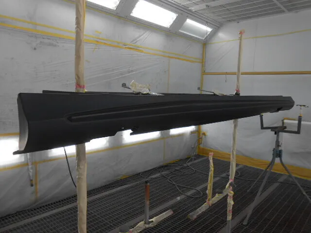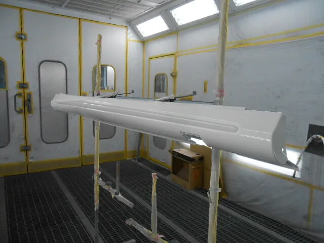 工場の静かな朝、ピカピカに仕上がったサイドスポイラーが