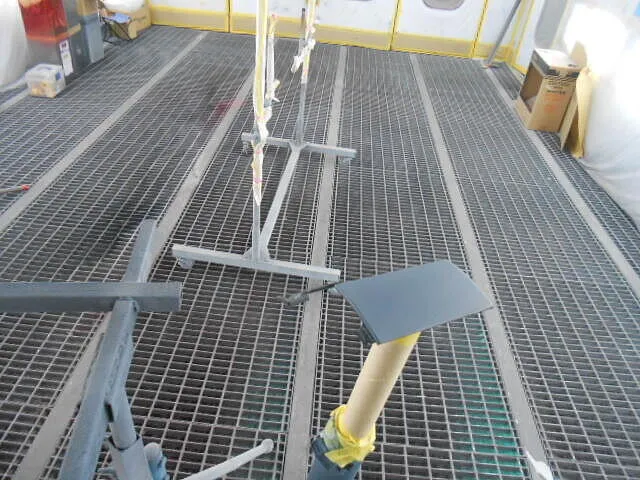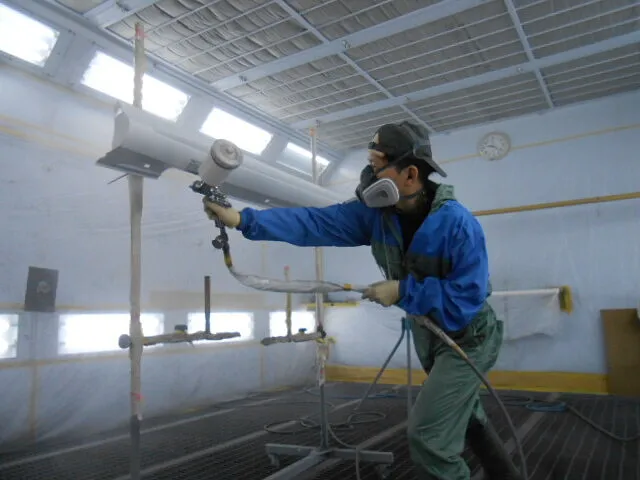 この写真は、塗装ブースの中で職人が丁寧に作業を進めている様子を切り取った一枚です。