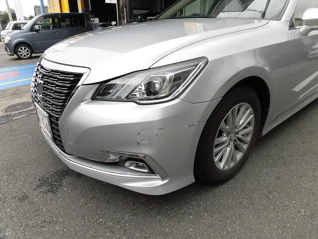 朝、クラウンのオーナー様が静かにご来店されました。フロント周りを見てみると、バンパーカバーや左フロントフェンダーに小さなキズが。
