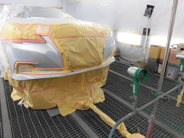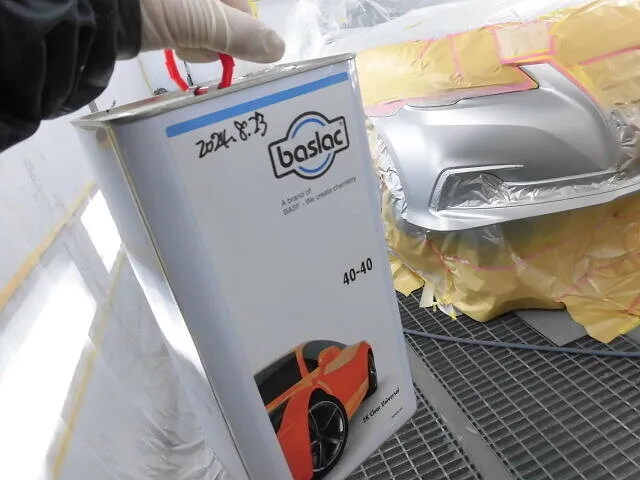 作業場に広がる独特の静けさの中、職人が手にした塗料缶と、丁寧にマスキングされたクラウンのフロントバンパー。