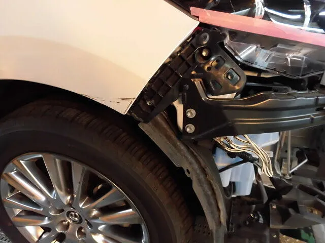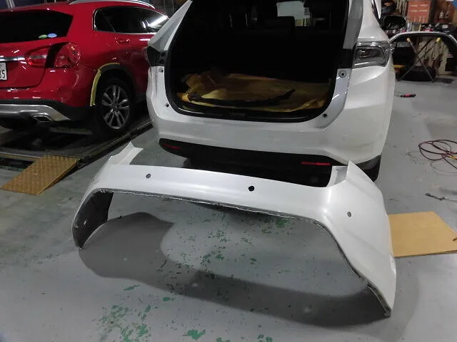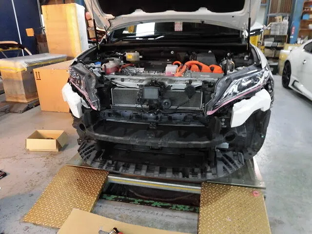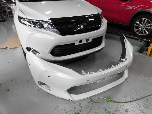 工場の一角で、ハリアーのフロントバンパーが丁寧に取り外されています。