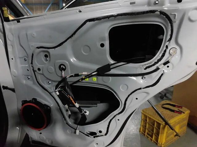 ドアパネルが外された状態を見ると、普段は目にしない車の内部構造に