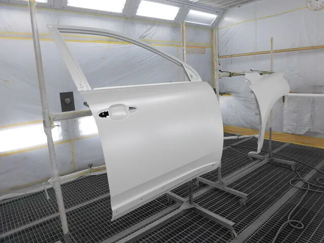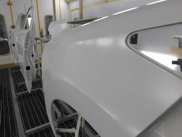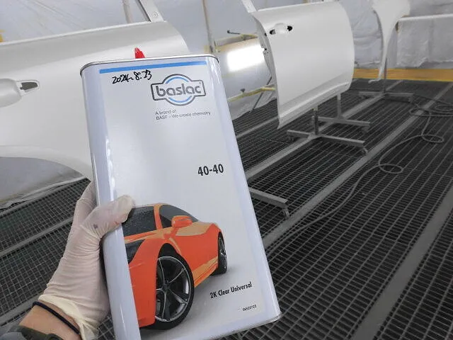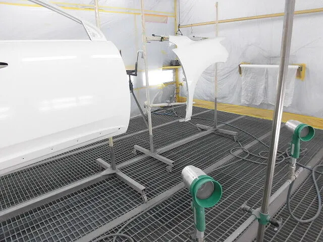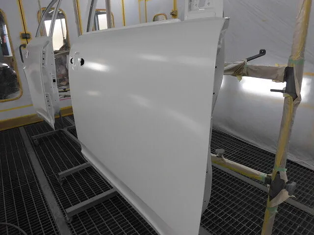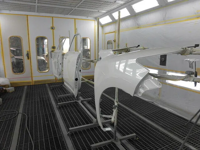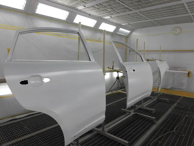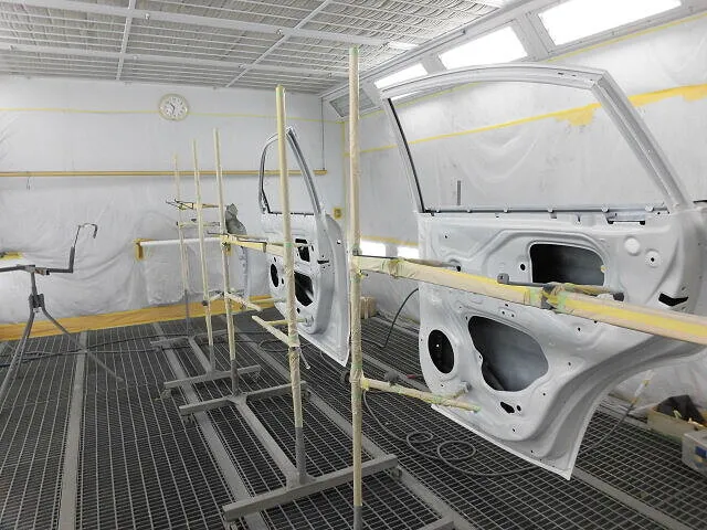 塗装ブースの中で、丁寧に並べられた車のパーツが目を引きます。