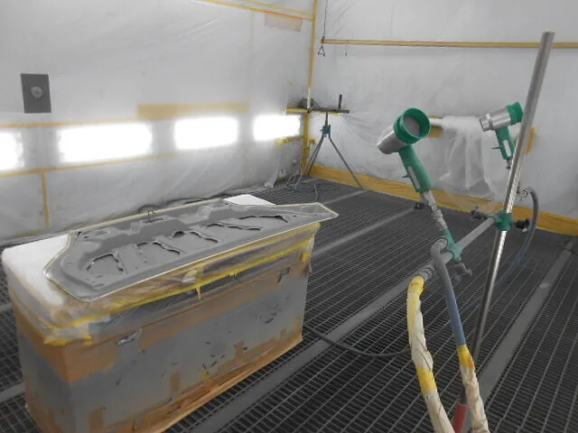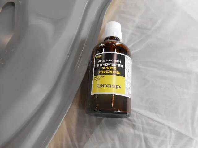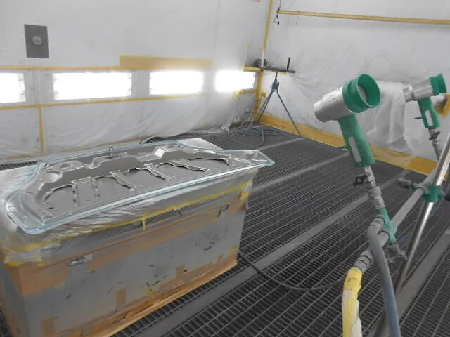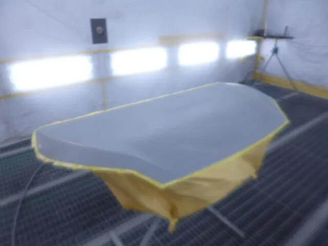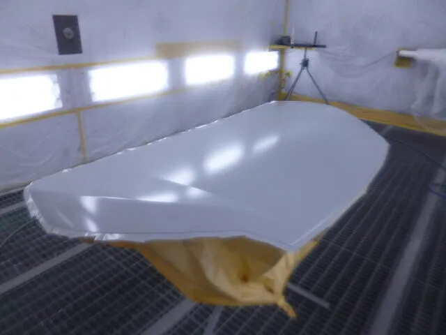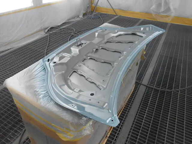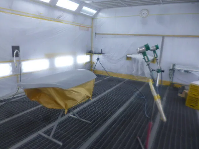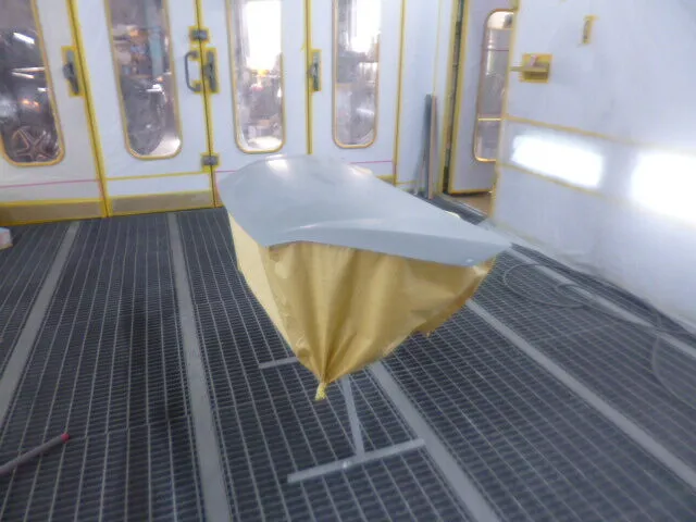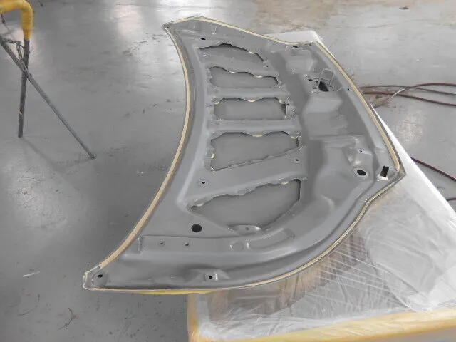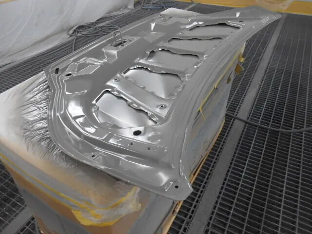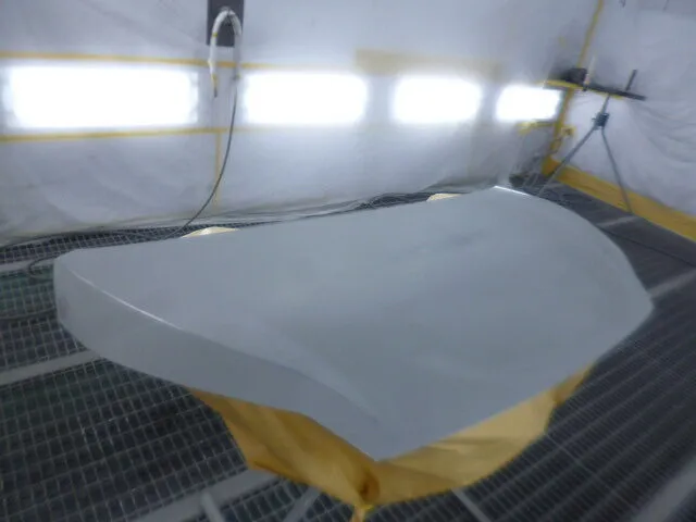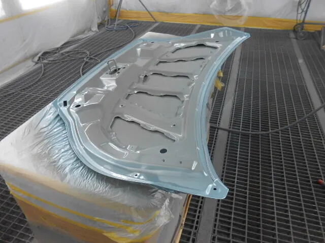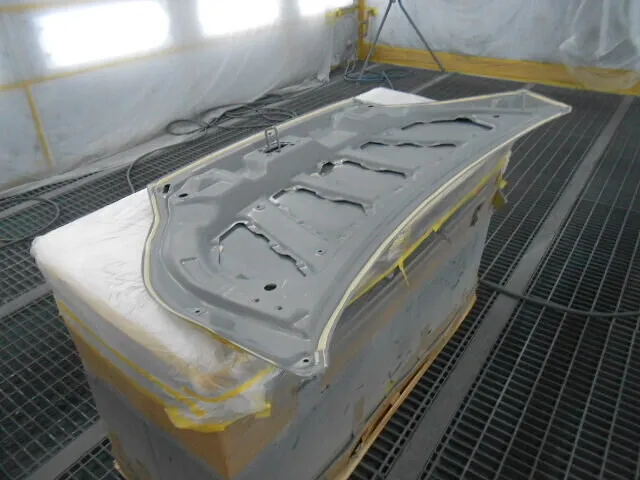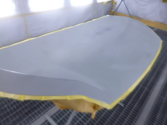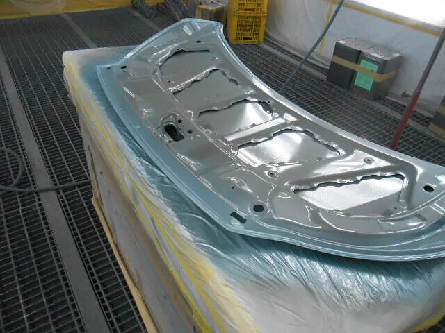 工場の一角で、丁寧にマスキングされたフードが静かに仕上がりを待っています。