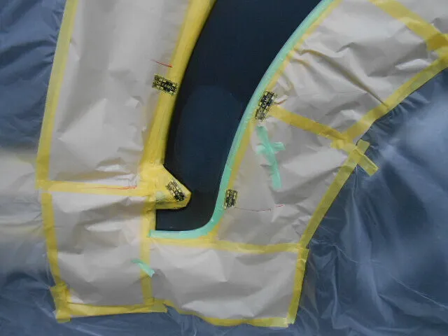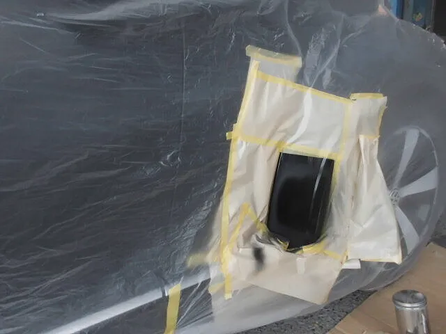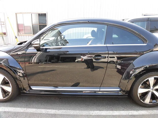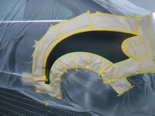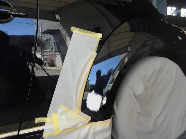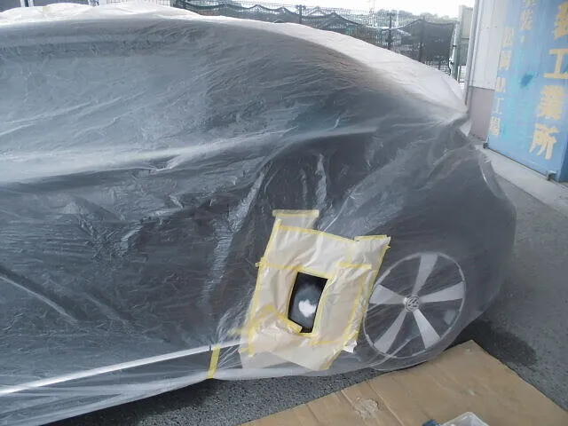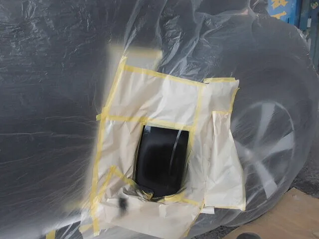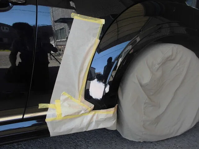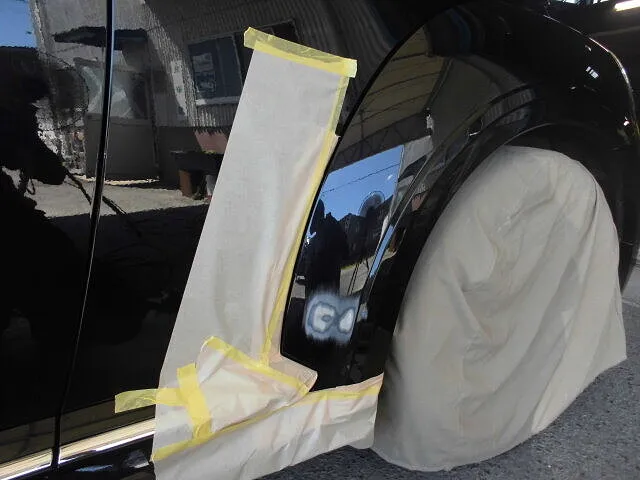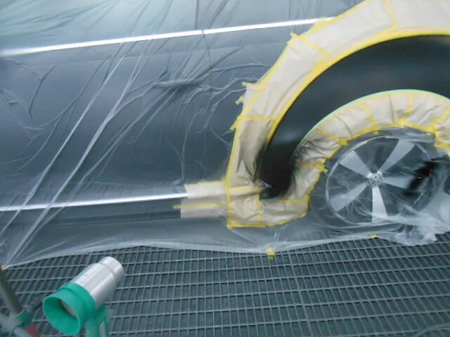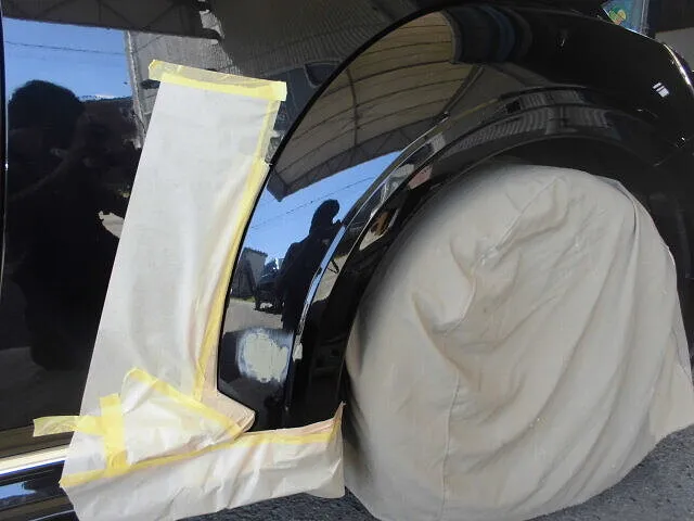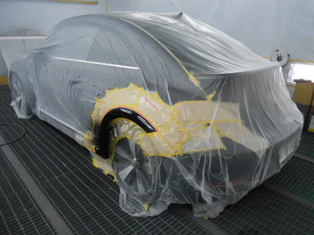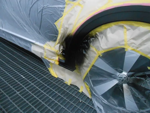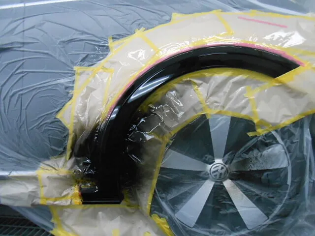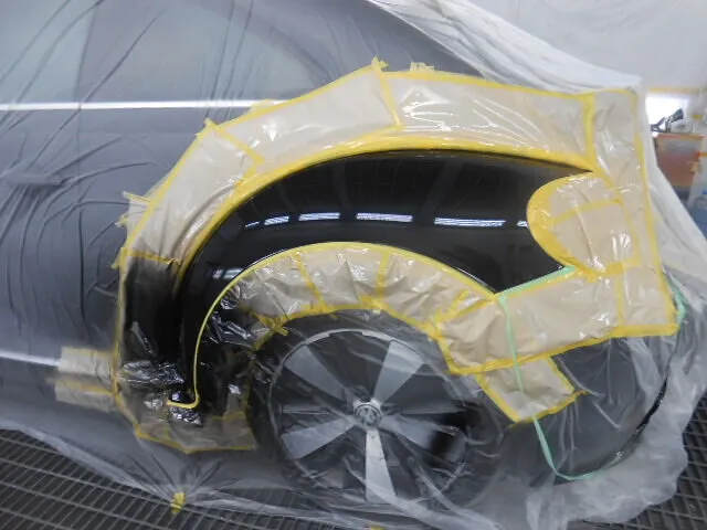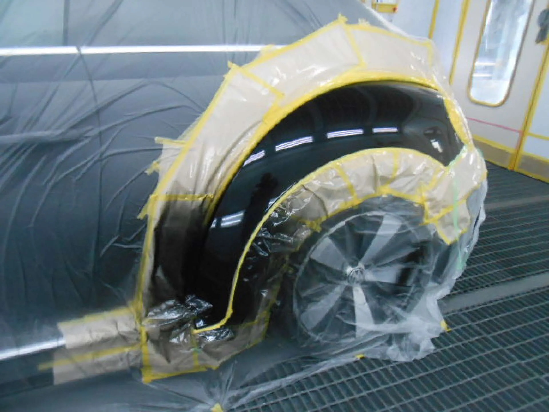 ビートルの左リヤフェンダーに丁寧にマスキングが施されている様子から、