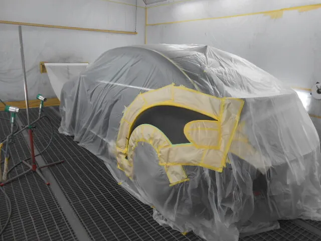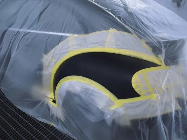 塗装ブースの中で、丁寧にマスキングされたビートルが静かに佇んでいます。