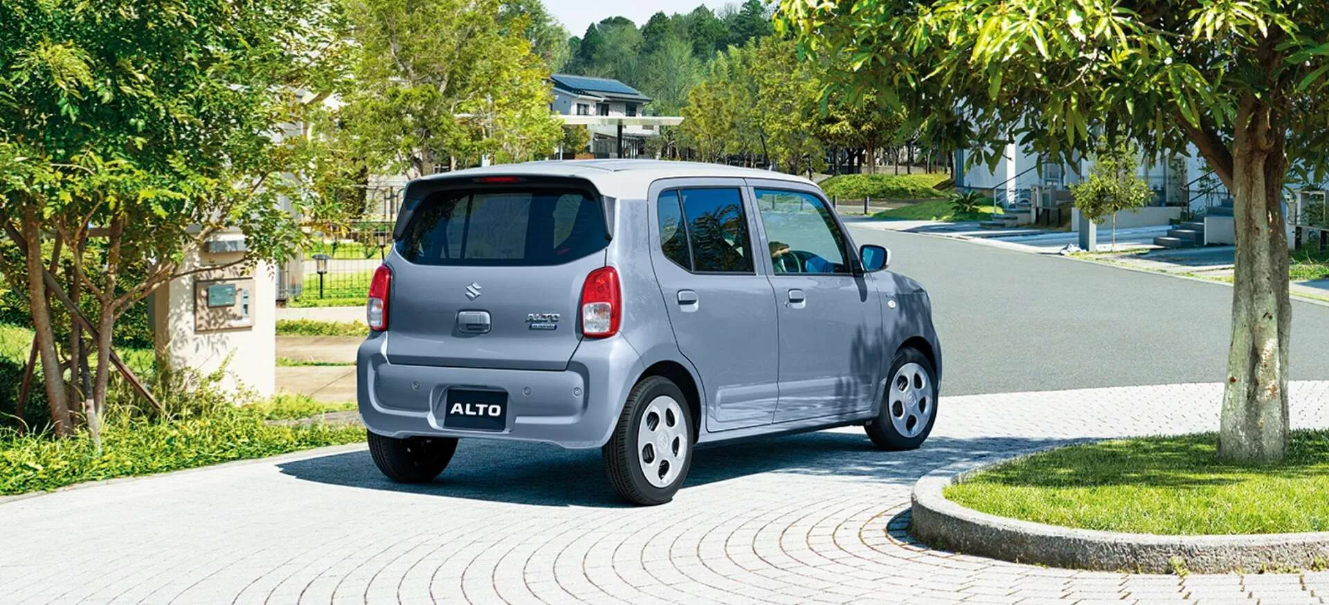 青空の下、スズキ アルトが静かな住宅街を走り抜ける様子が印象的です。