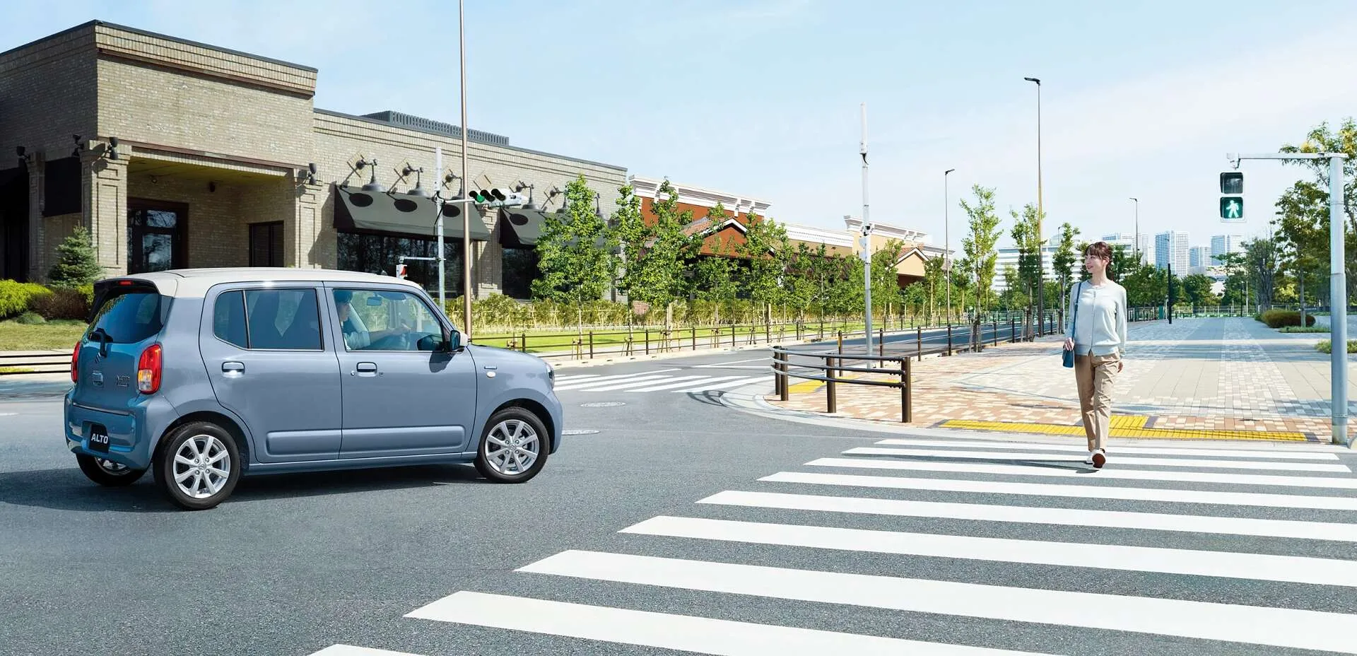 横断歩道の前で停車するスズキ アルト。この一瞬に、日常の安心感が