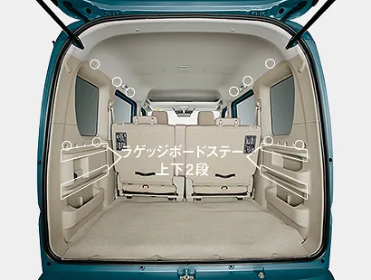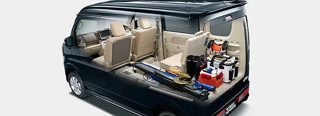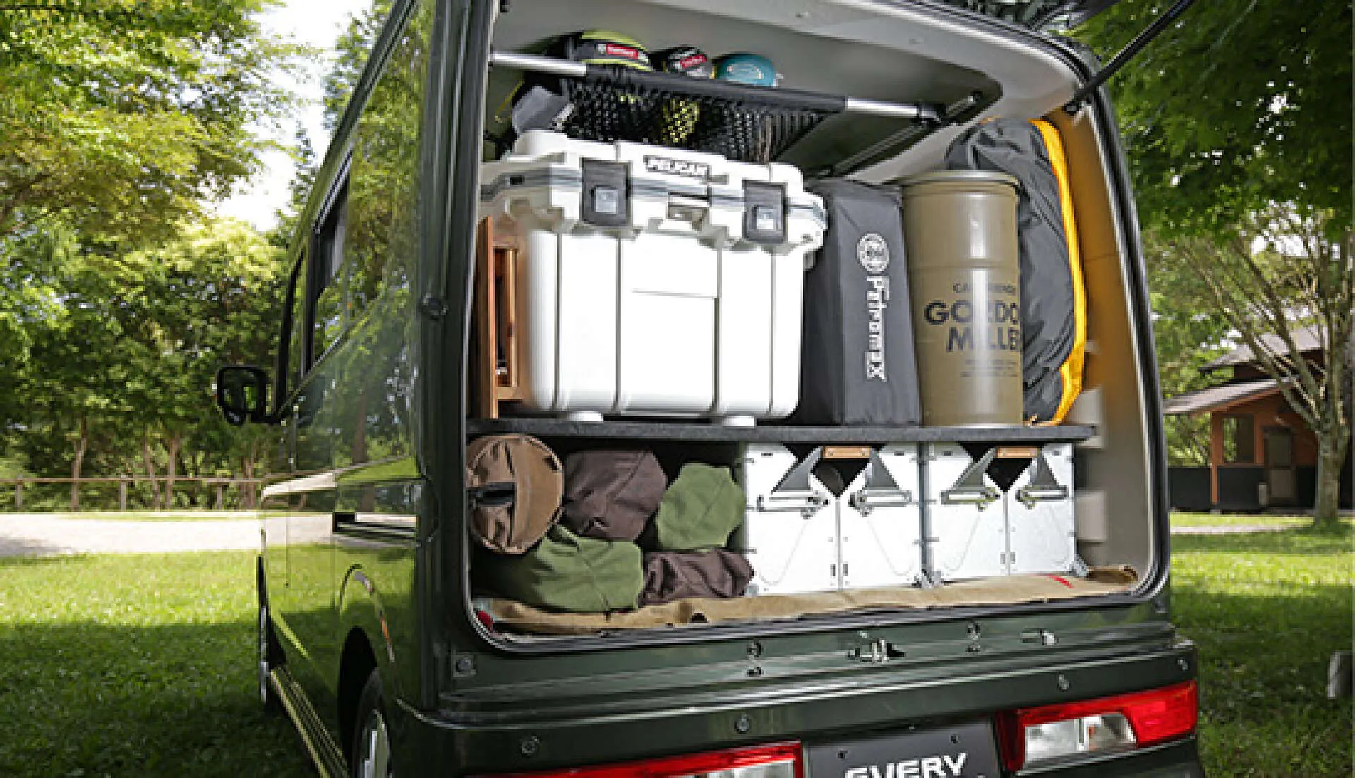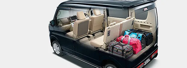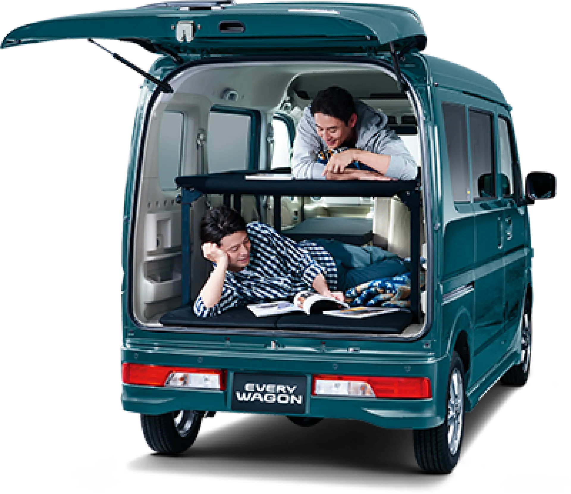 エブリイワゴンのリアゲートを開けると、そこには思わずくつろぎたくなる空間が広がっています。