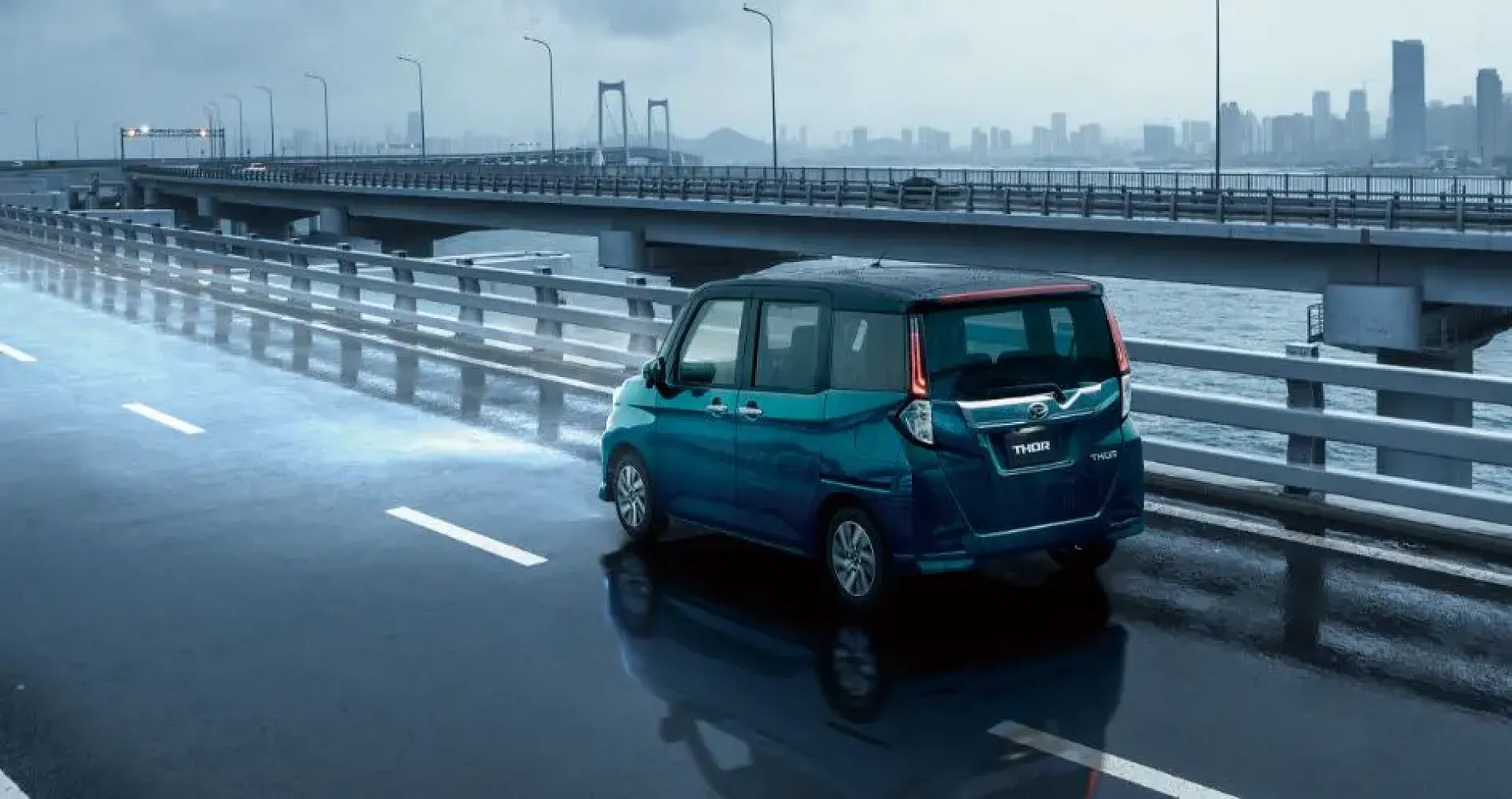雨に濡れた橋の上を、鮮やかなブルーのダイハ トール静かに走抜けてく様子印象的です