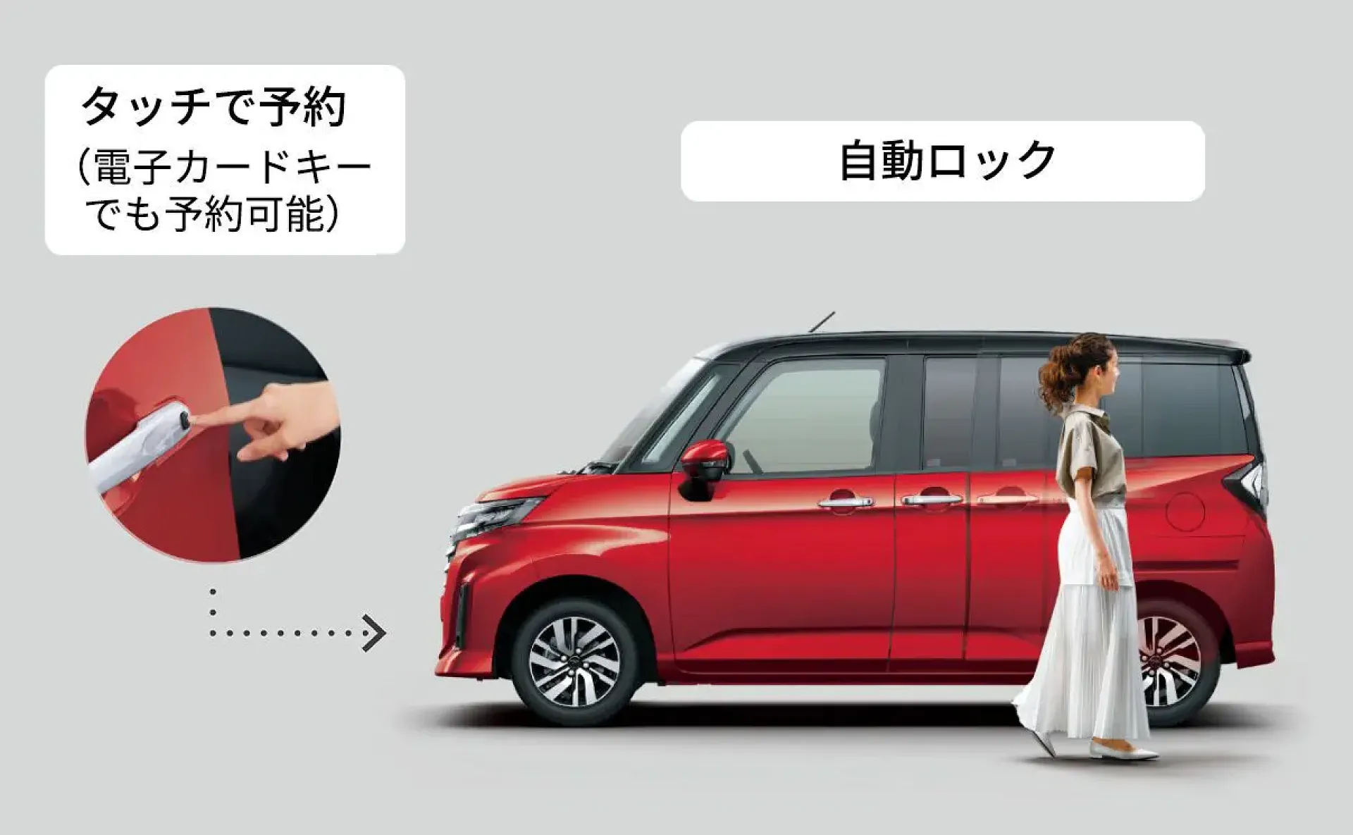 赤い車の横を歩く女性が、さりげなくドアハンドルに手を伸ばしている様子が印象的です。普段のお買い物やお子さまの送り迎えなど、忙しい毎日の中で「タッチで予約」できる機能はとても便利だと感じます。電子カードキーでも操作可能なので、荷物が多い時もストレスなく乗り降りできます。