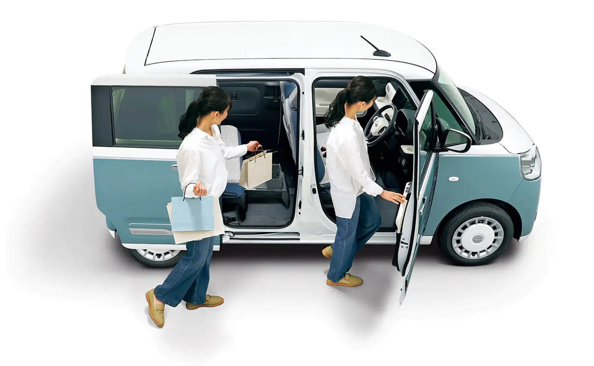 ムーヴキャンバスの横に立ち、買い物袋を手にした女性が車へ乗り込む様子は、