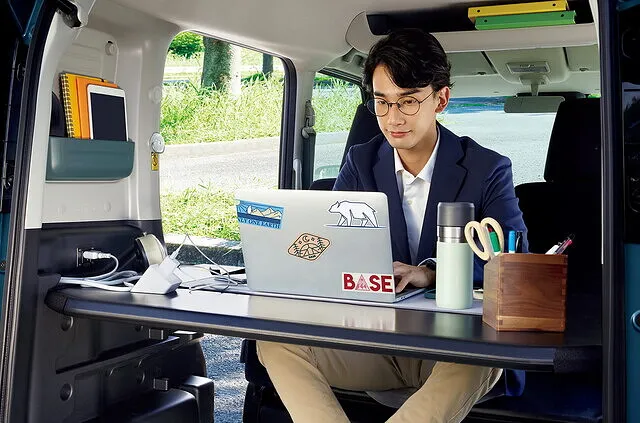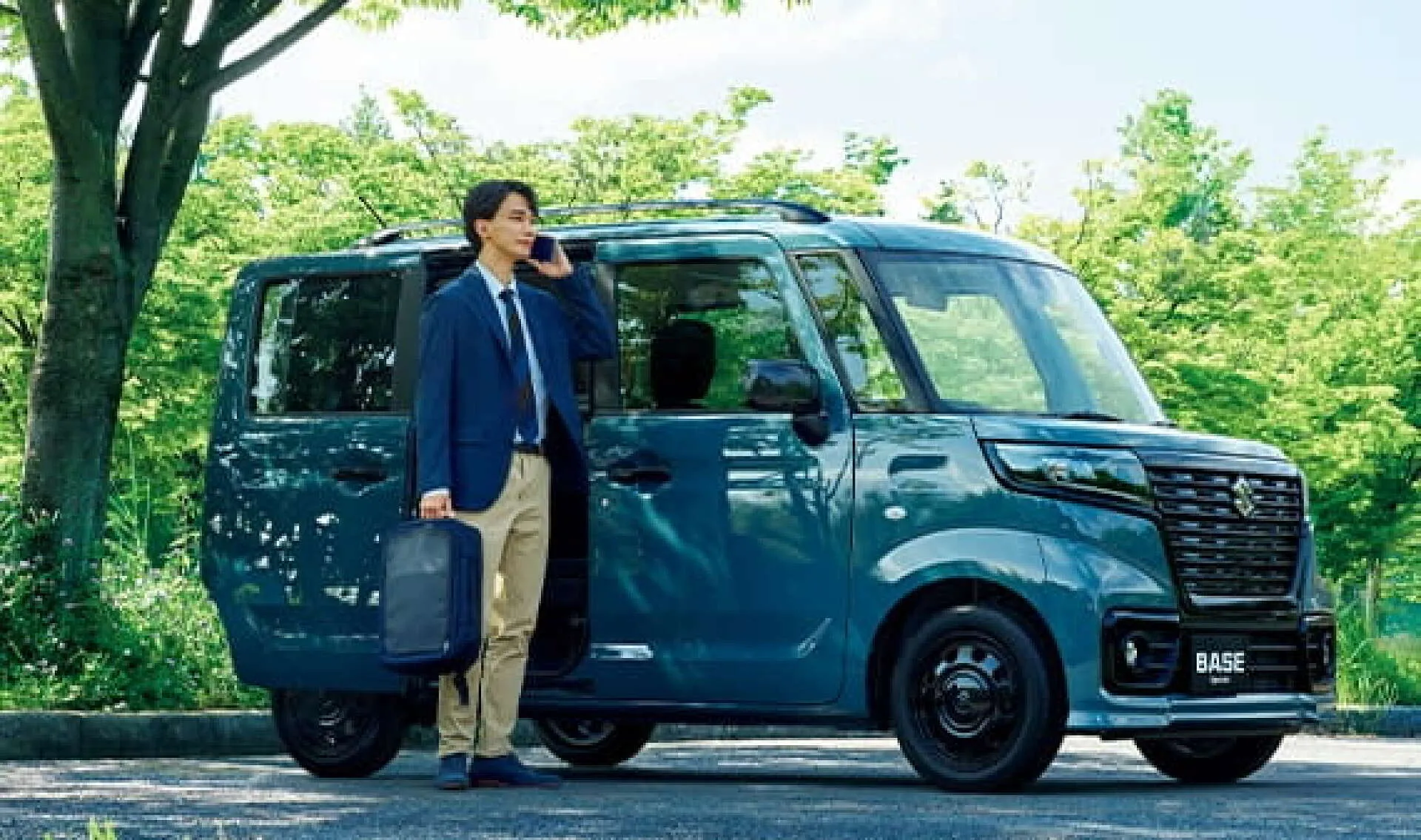 青空の下、スズキ スペーシアベースの横で電話をかけるビジネスマンの姿が印象的です。