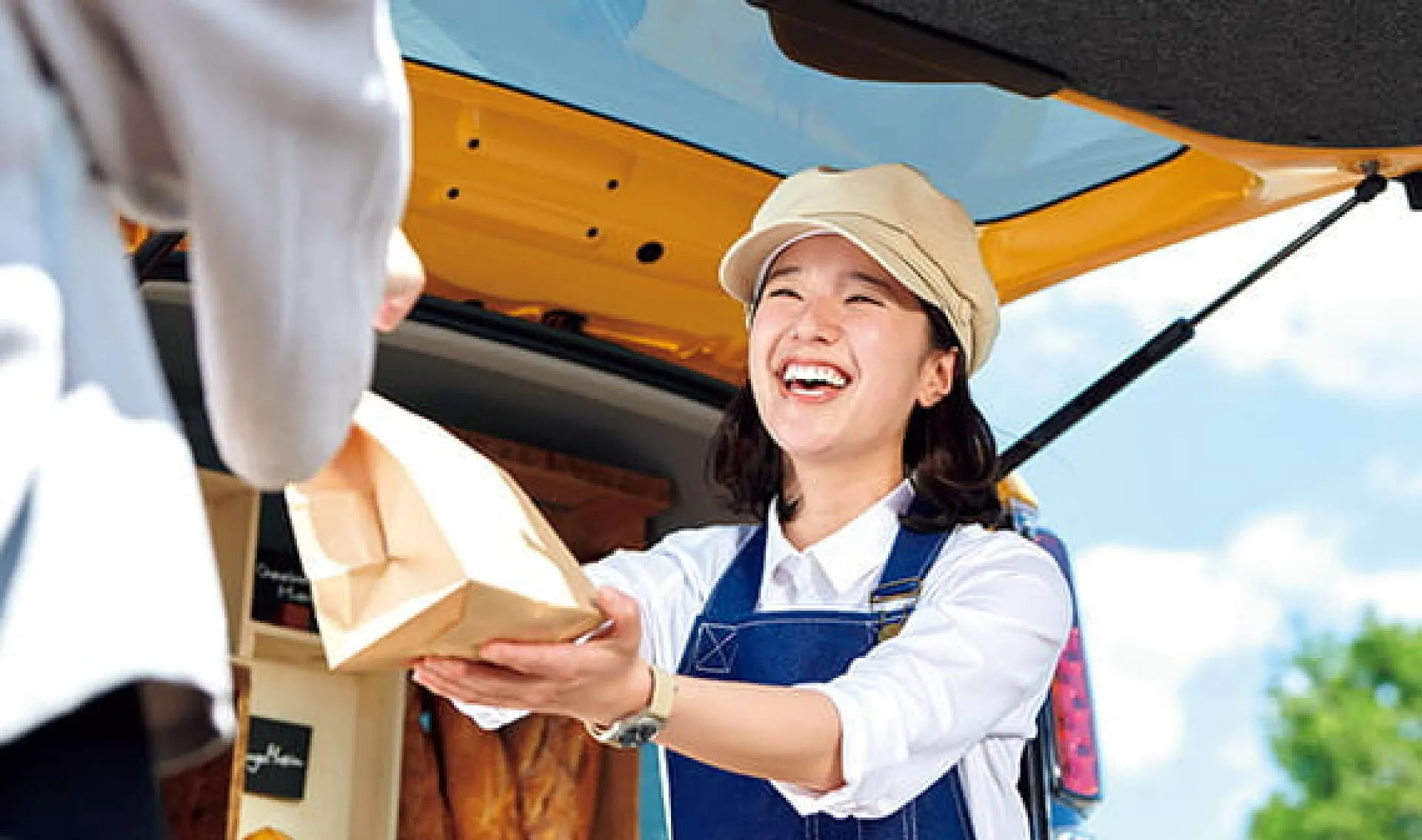 スペーシアベースの後ろで、明るい顔ととも手渡される紙袋。