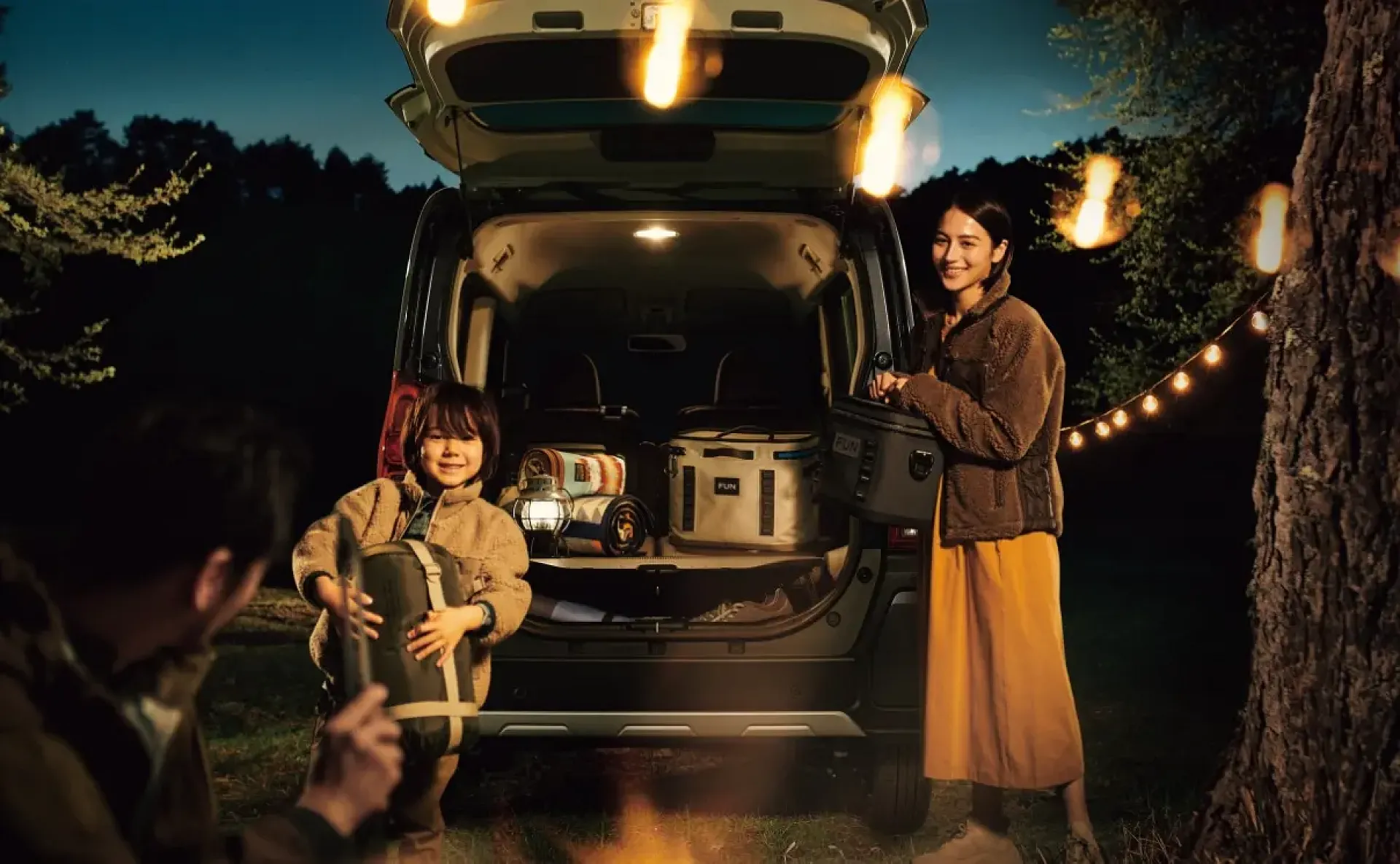 夜の静けさの中、アウトドアランタンが優しく灯る車の後ろで、家族みんなが自然と笑顔になります。
