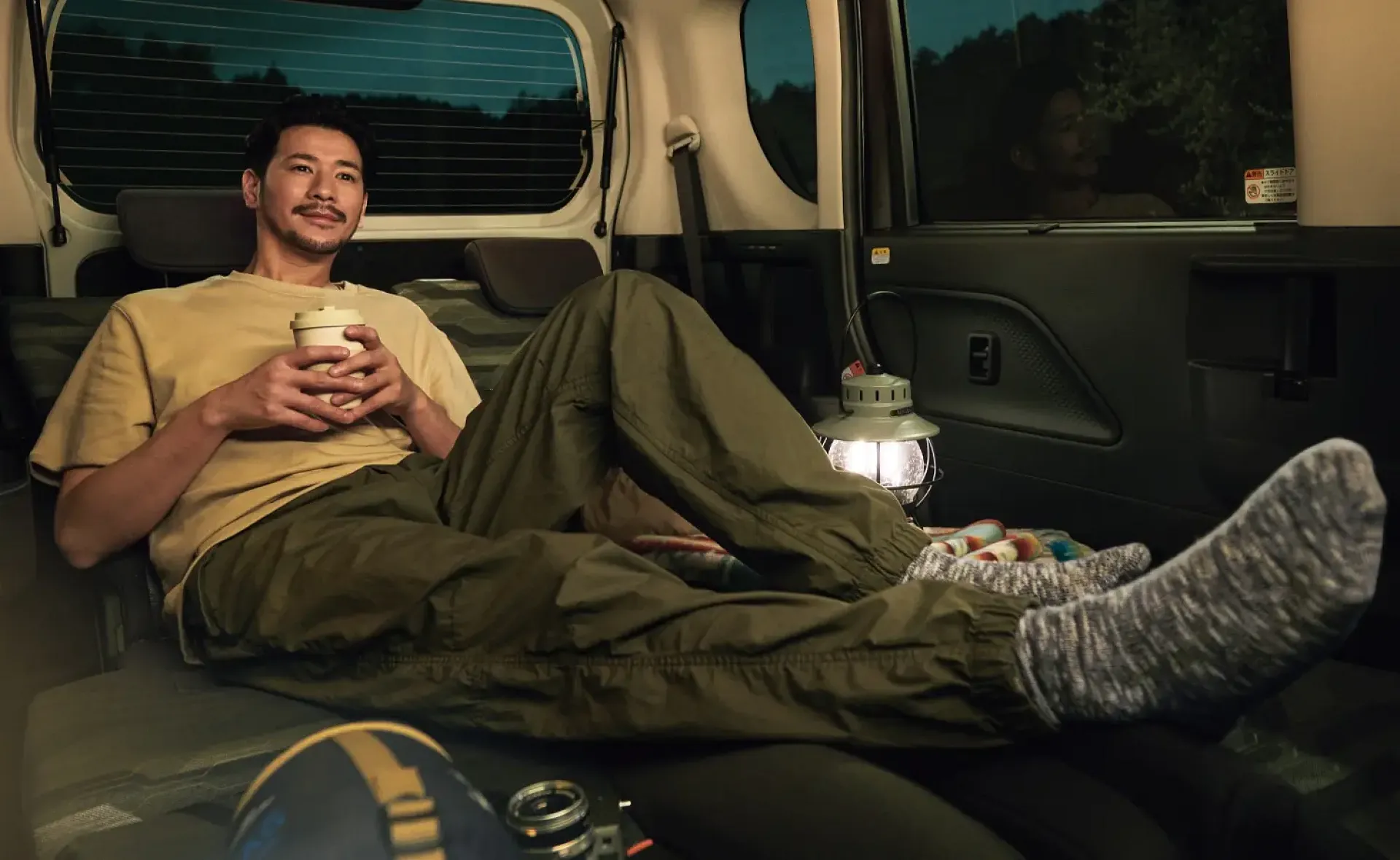 夕暮れ時、車内でくつろぐひととき。