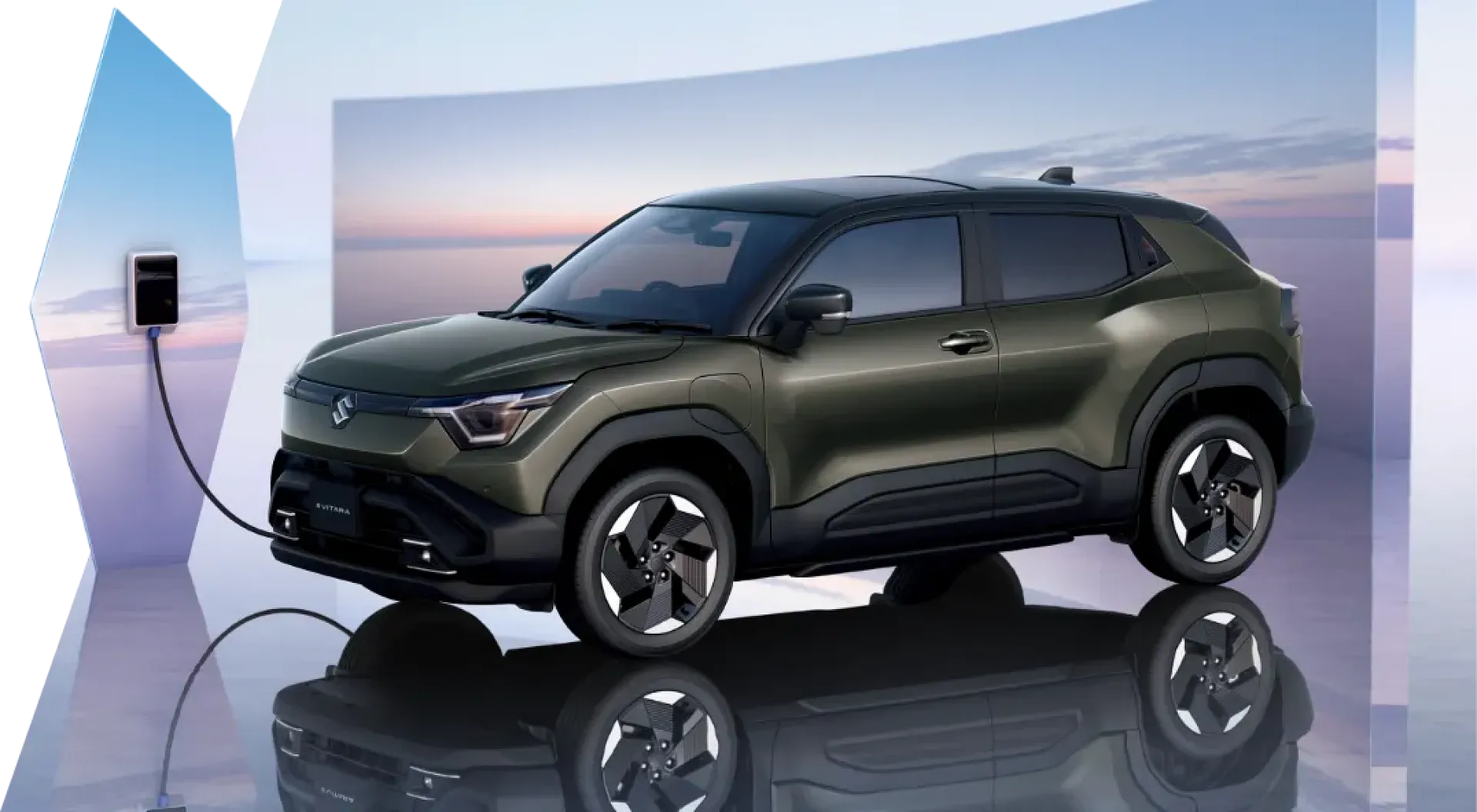 夕焼け空を背景に、静かに充電中のSUVが目を引きます。