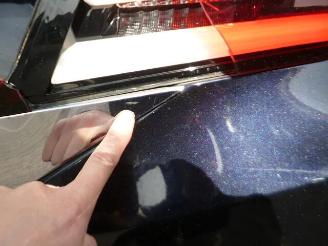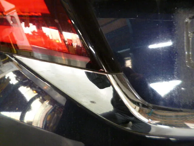 リヤバンパーの角にそっと指を添えて、スタッフが細かなキズや仕上がり具合を丁寧に確認しています。
