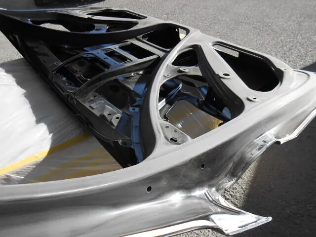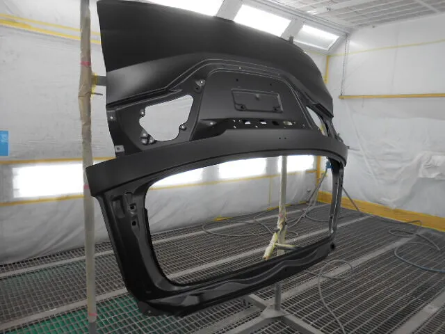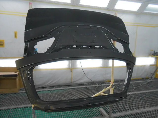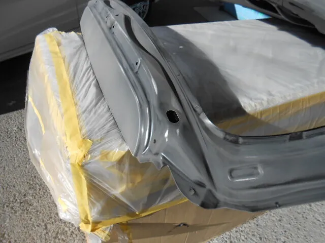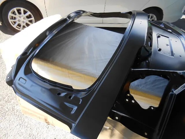 リヤバンパーやバックドアの部品が、作業台の上で静かに出番を待っています。