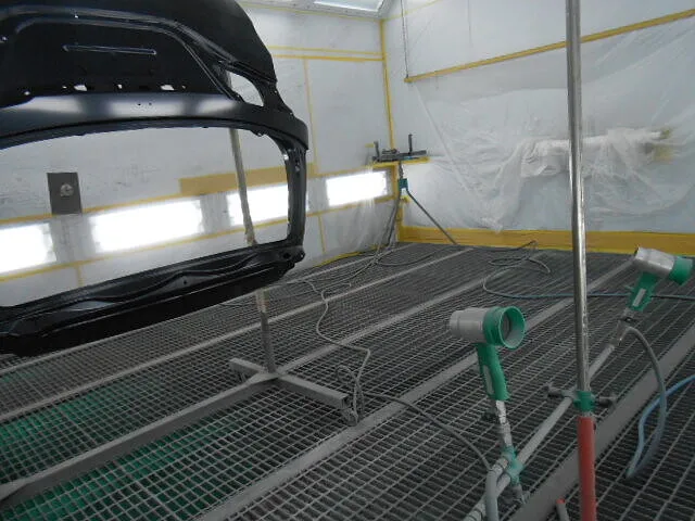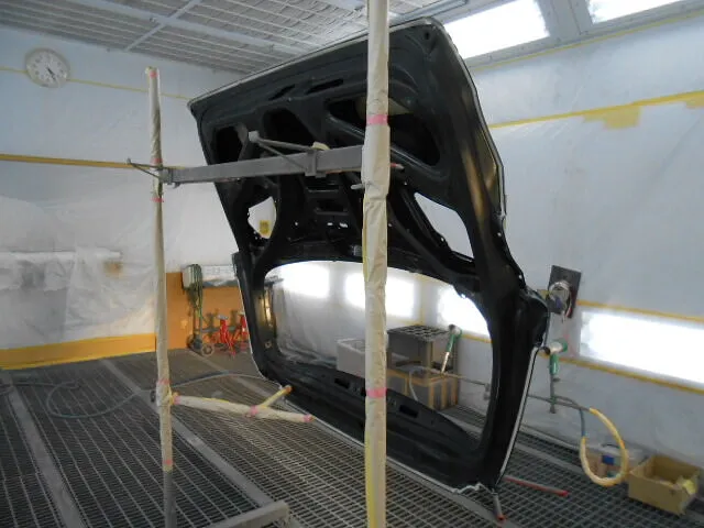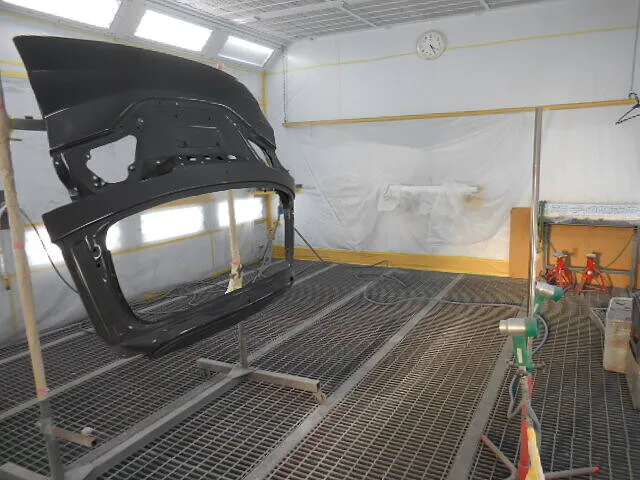 作業場に吊るされたリヤバンパーが、静かに次の工程を待っています。