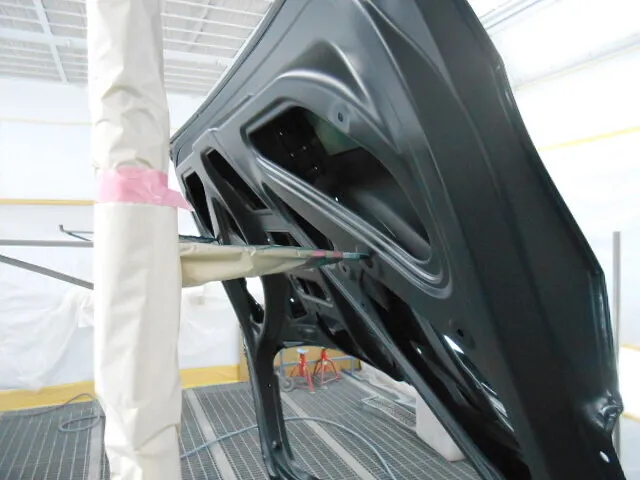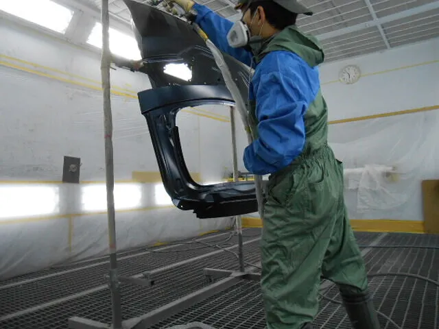 画像のような専用ブースでの作業は、ホコリやムラを防ぎ、美しい仕上がりを実現するための大切な工程です。