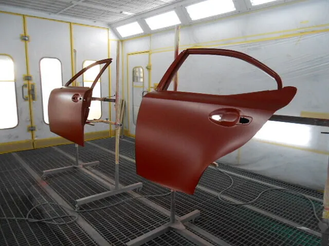 作業場に並ぶレクサスのドアパネルが、静かに新しい色をまとっていく様子は、
