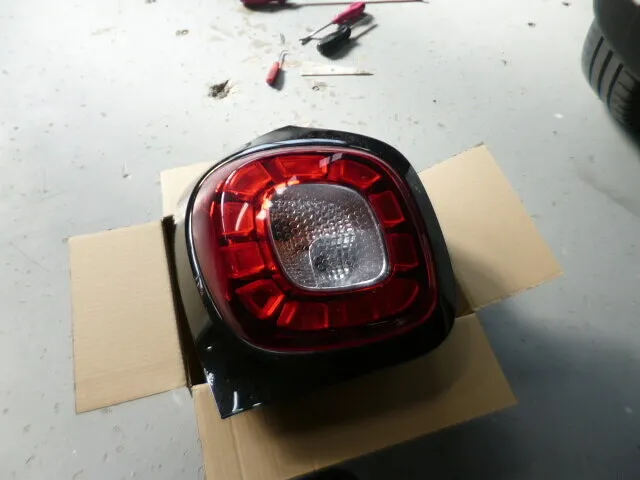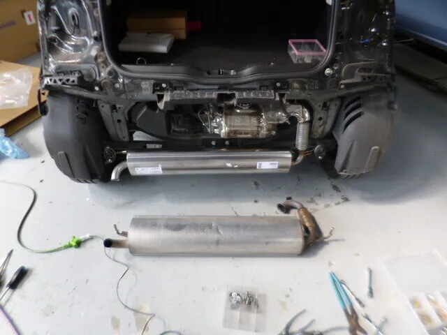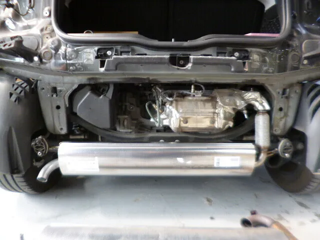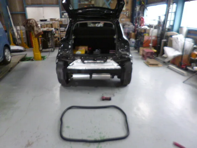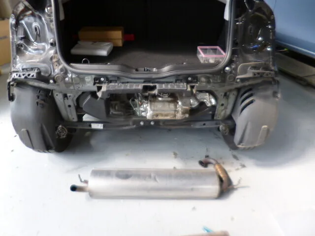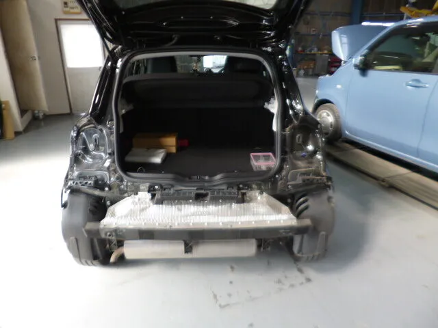 工場の一角で、リヤバンパが外された小さなスマートカーが静かに作業を待っています。