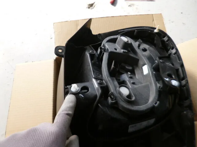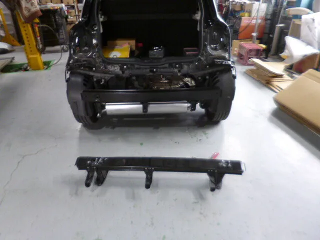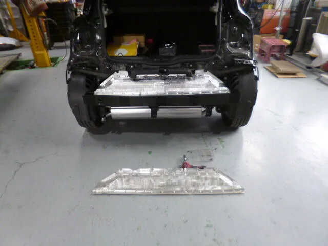 作業場で、スタッフがリヤバンパの内部構造を丁寧に確認している様子です。