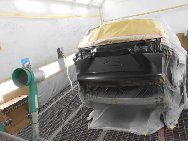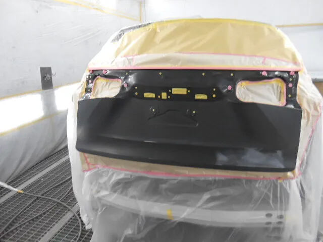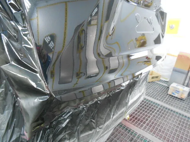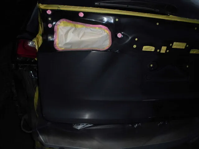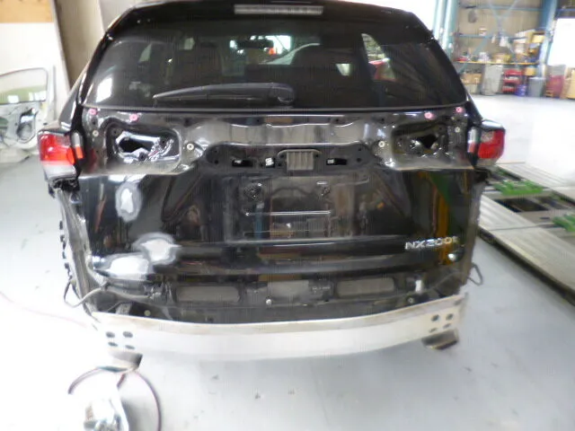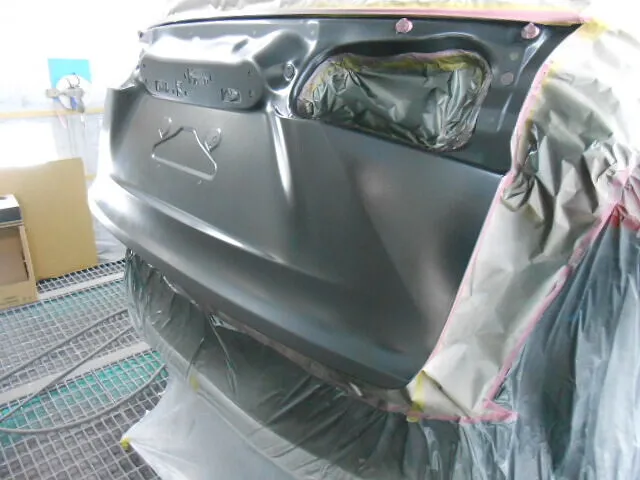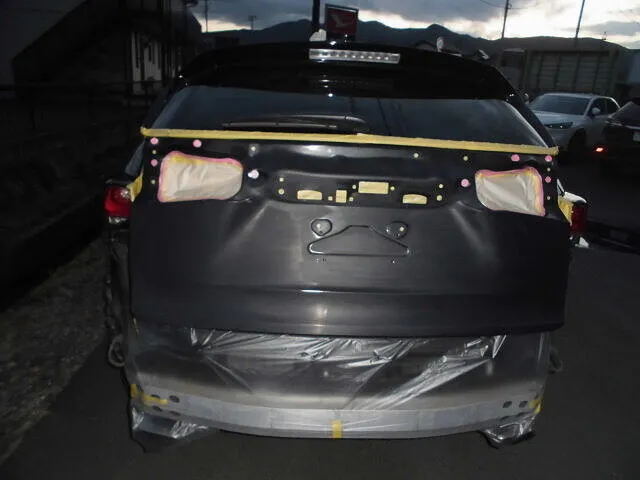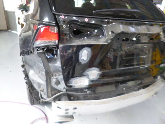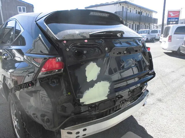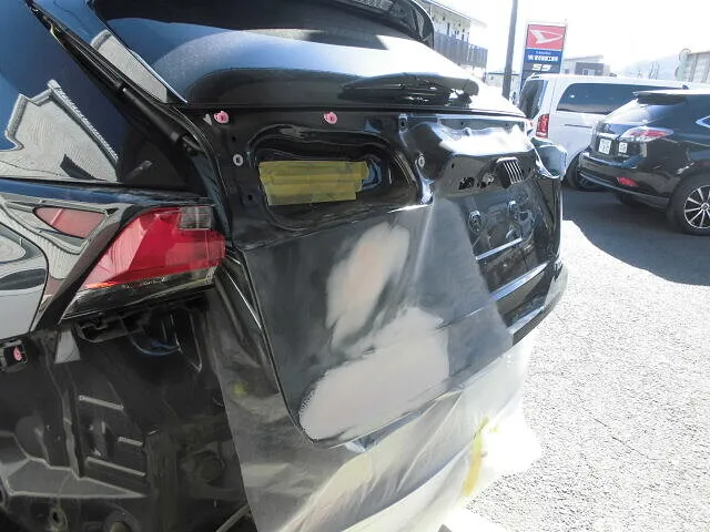 実際にお客様からご依頼いただいたレクサスのリヤバンパー交換とバックドア鈑金塗装修理を進めています。