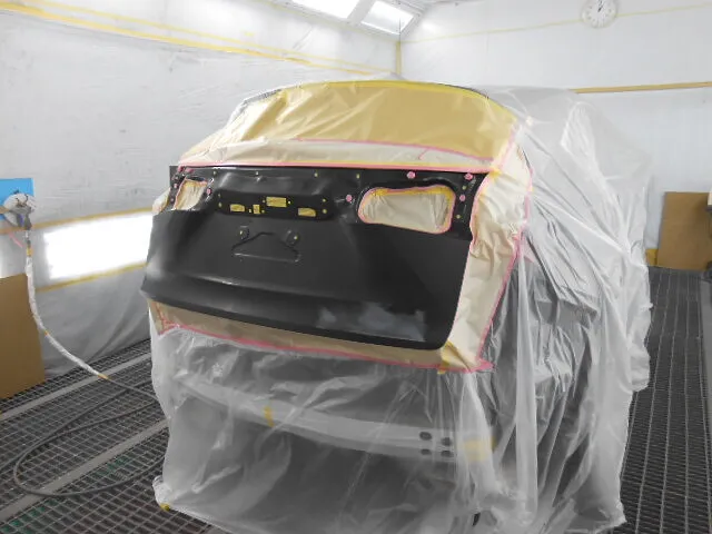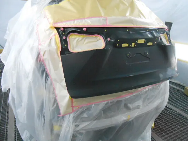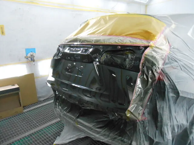 丁寧にマスキングされたリヤバンパーとバックドアは、まさに職人たちの手仕事の真っ最中です。
