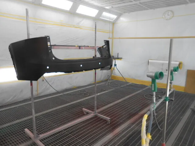 朝の光が差し込む工場で、丁寧に養生されたリヤバンパーが作業台に置かれています。