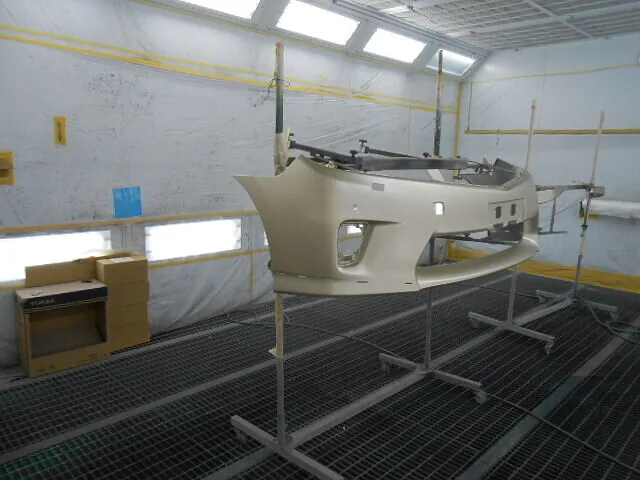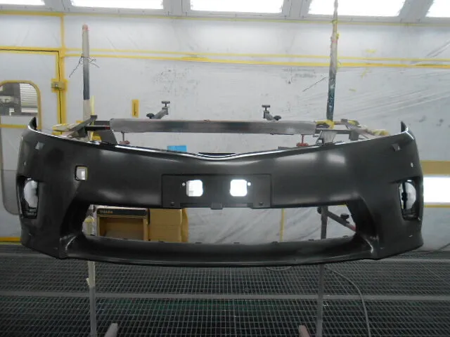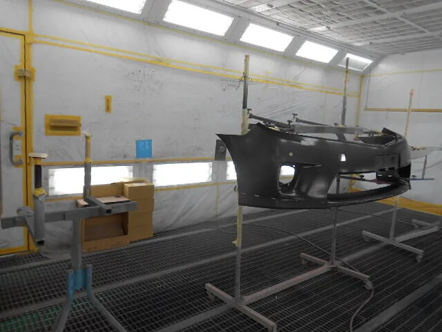 工場の一角で、丁寧に吊るされたフロントバンパーが目を引きます。