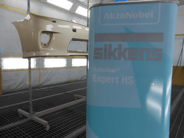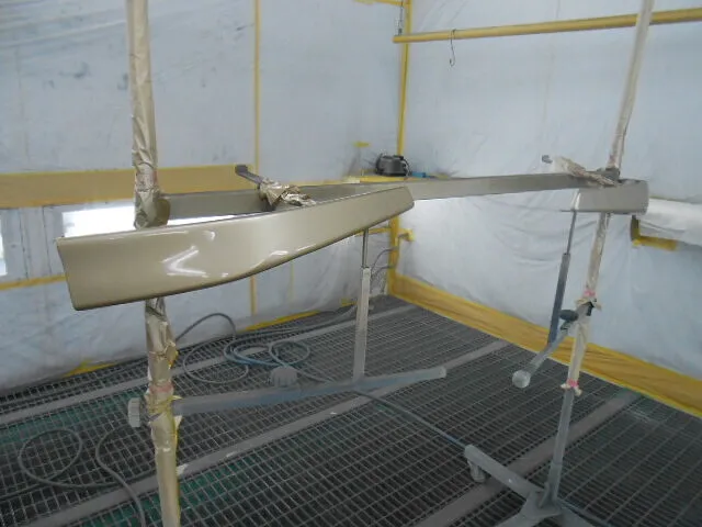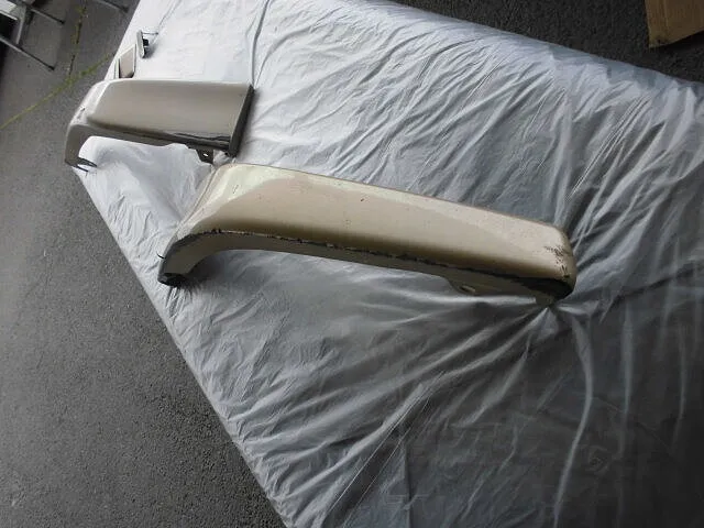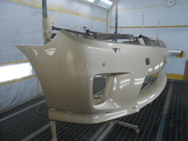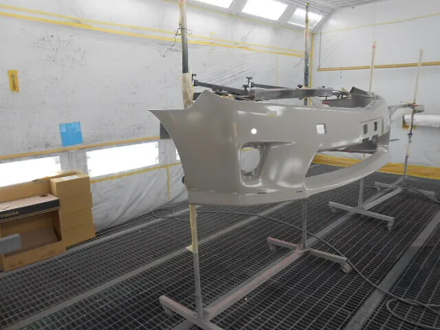 作業場の一角で、丁寧に養生されたフロントバンパーが静かに仕上げを待っています。