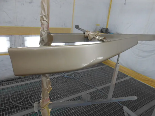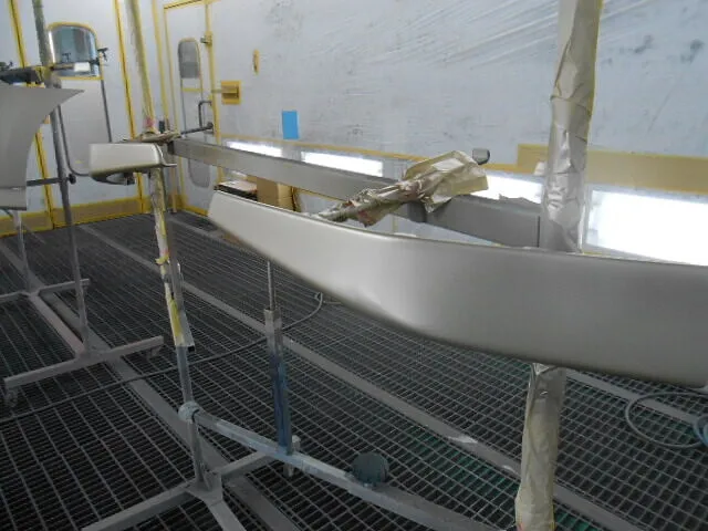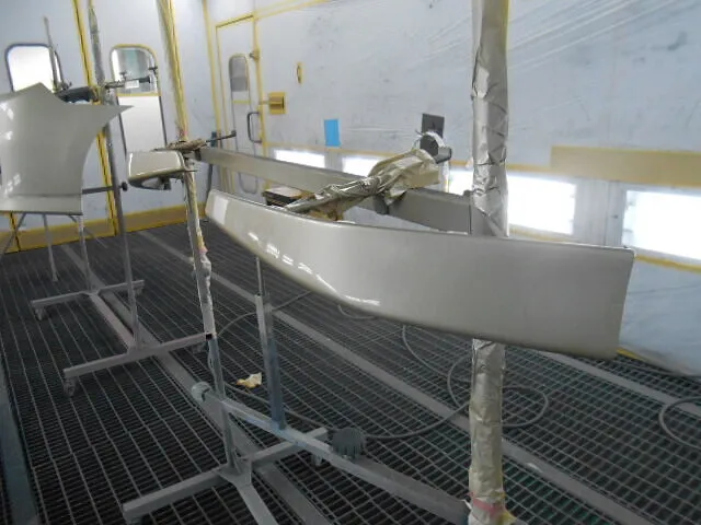 作業場に差し込む光の中、フロントバンパーが丁寧に