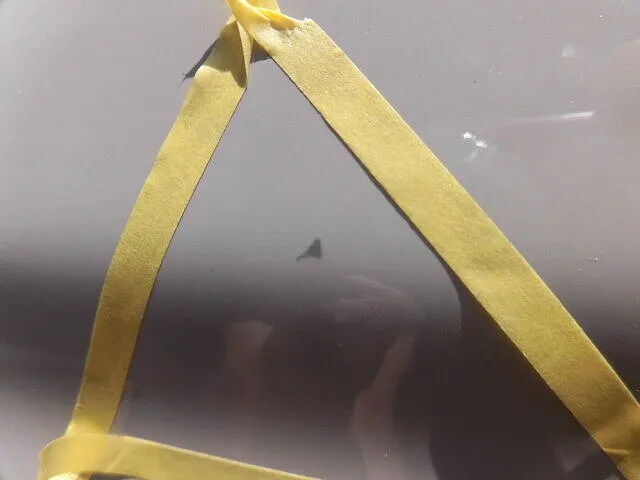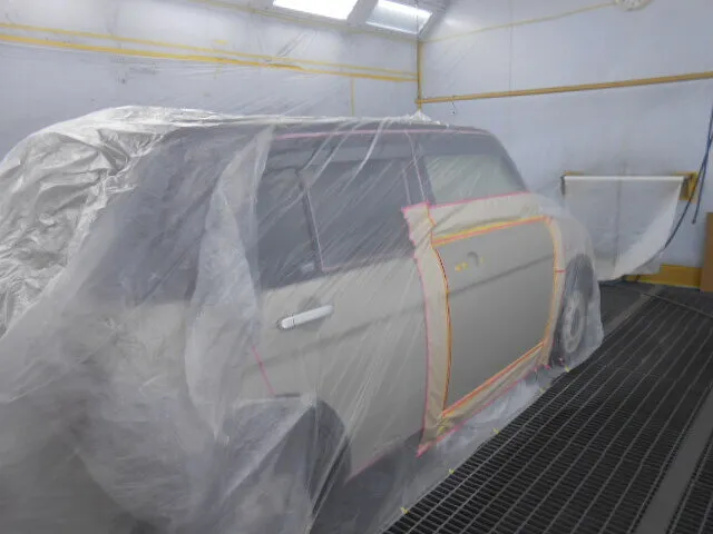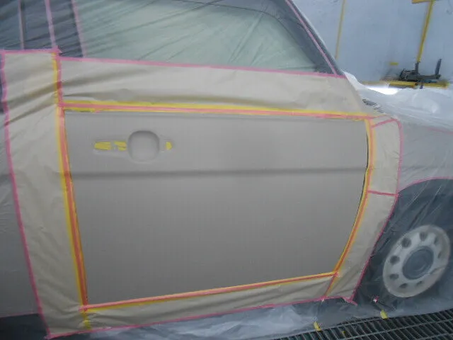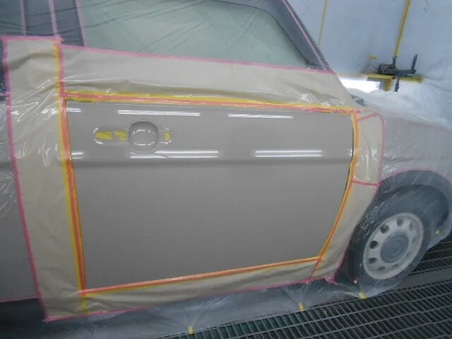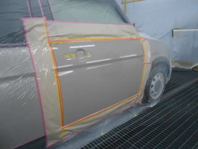ラパンの右フロントドアが丁寧にマスキングされている様子、
