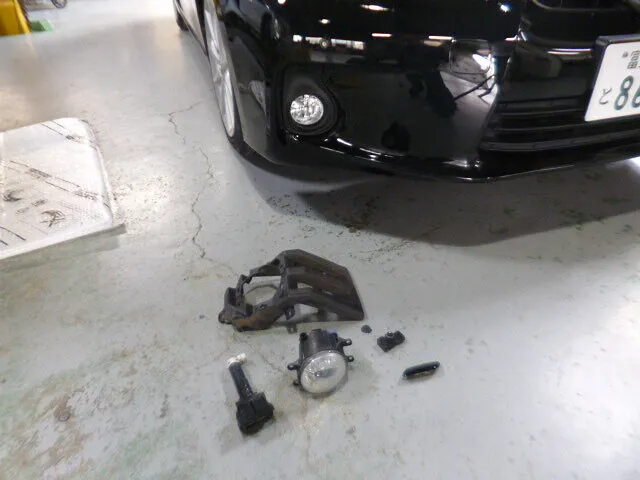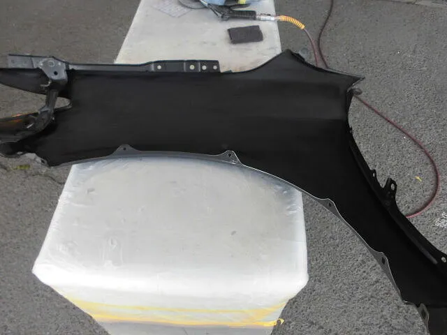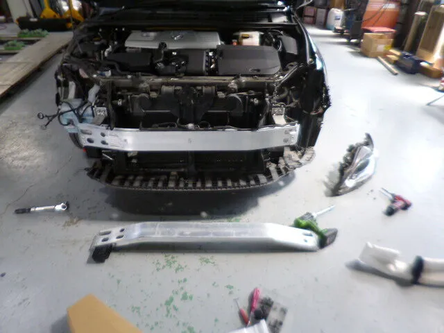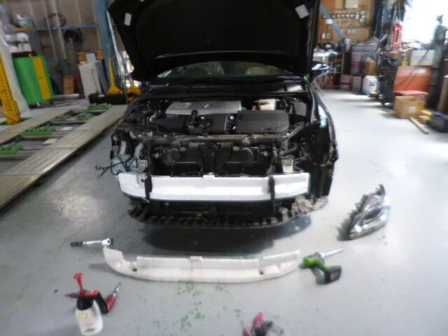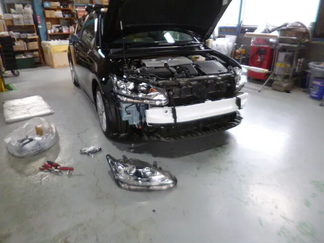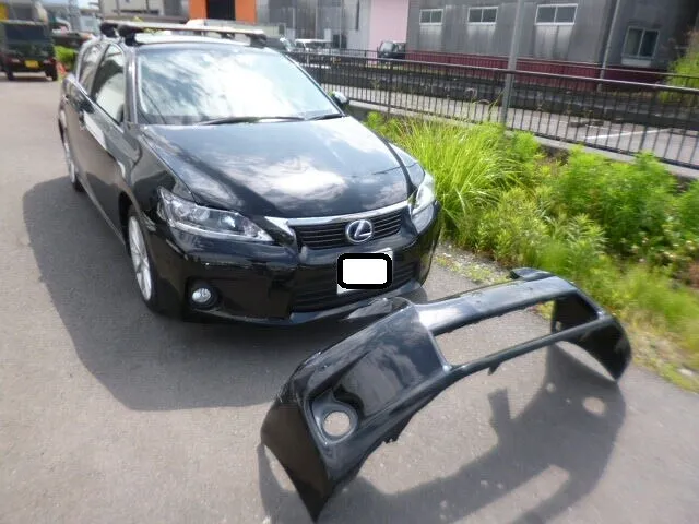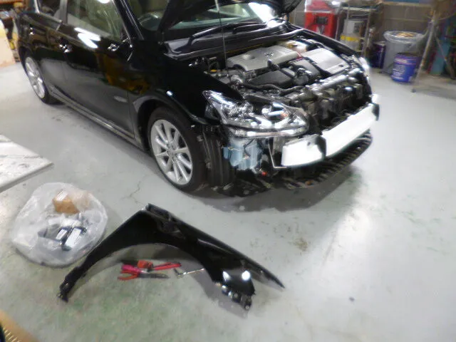 私たちの現場では日常です。お客様からお預かりしたレクサスCTの修理依頼、今回はフロントバンパーと右側フェンダーの交換塗装でした。