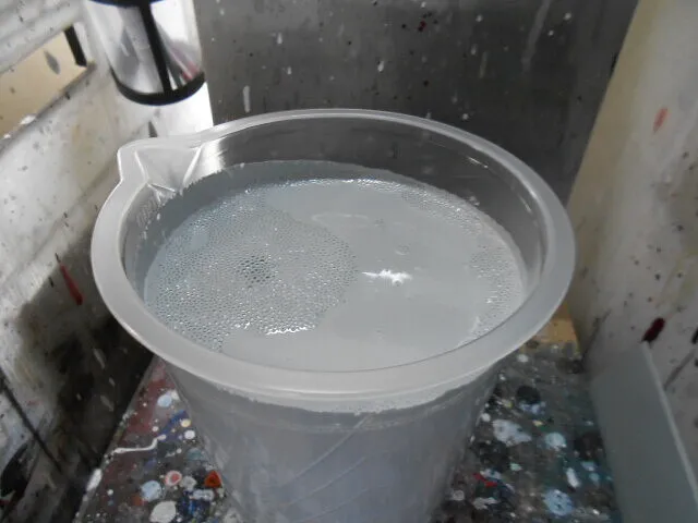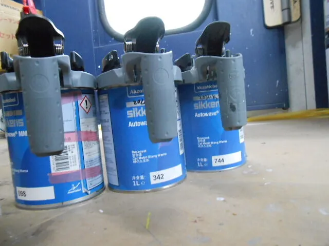 作業場の一角に並ぶ塗料缶たち。普段はあまり目につかない存在ですが、