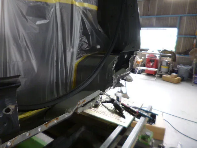 工場の一角で、ホンダシャトルがしっかりと作業台に固定されている様子が写っています。