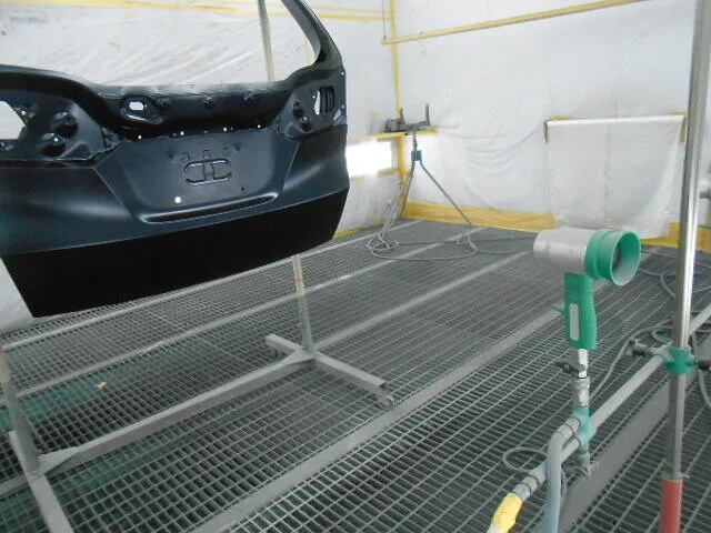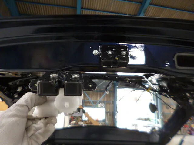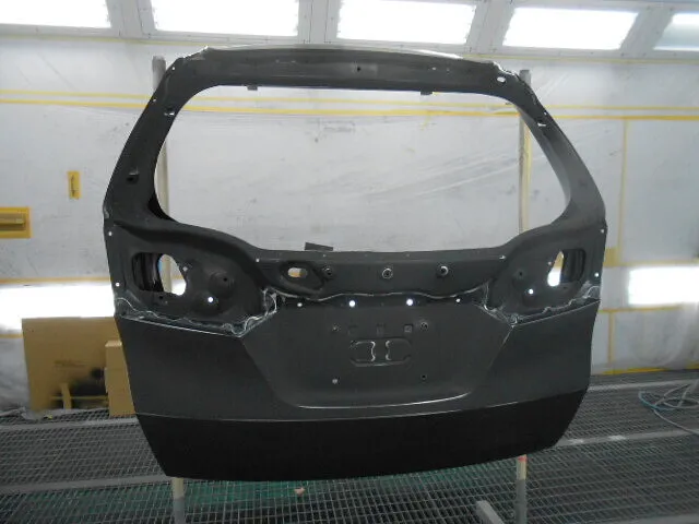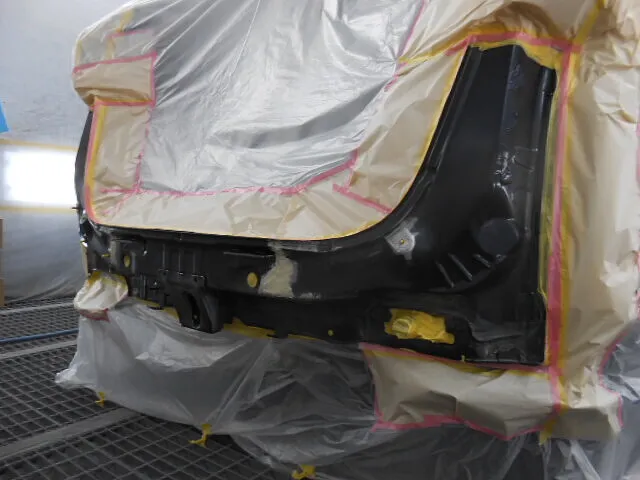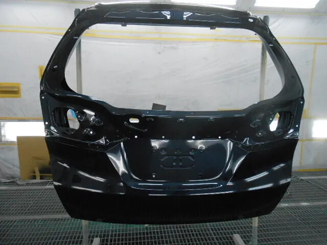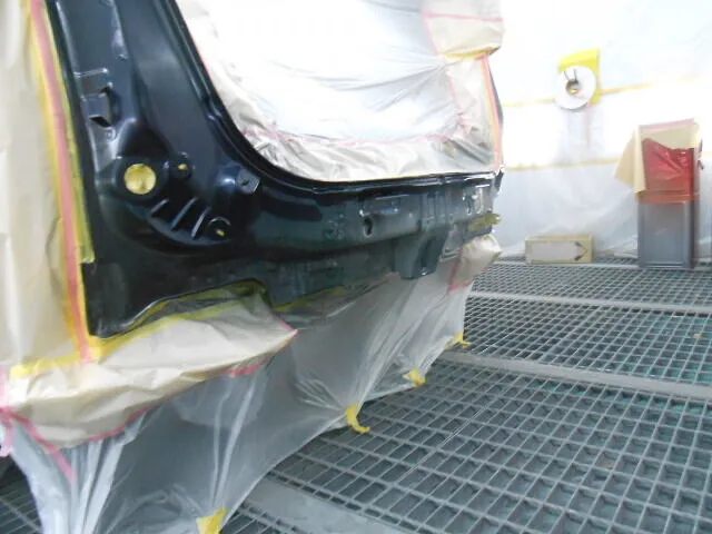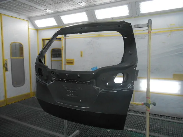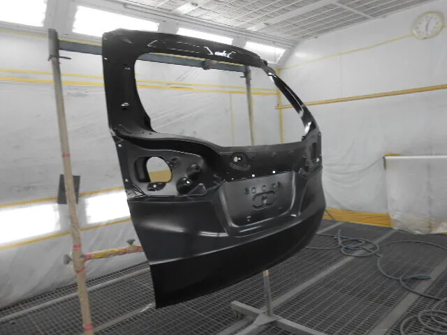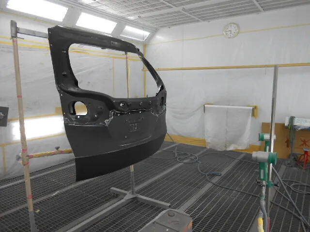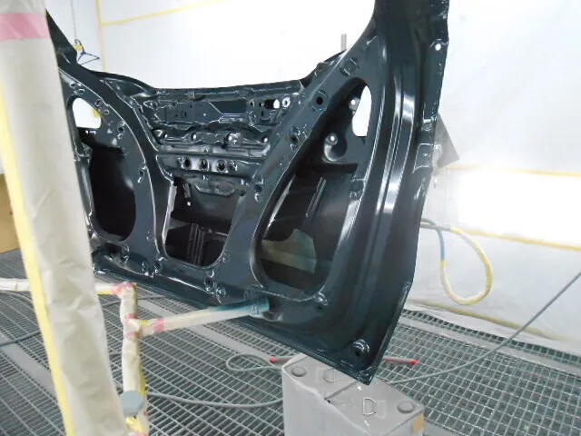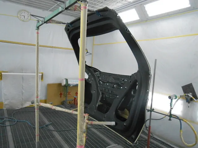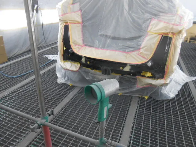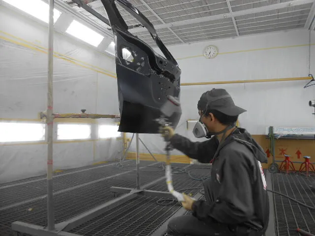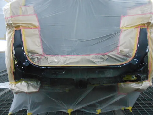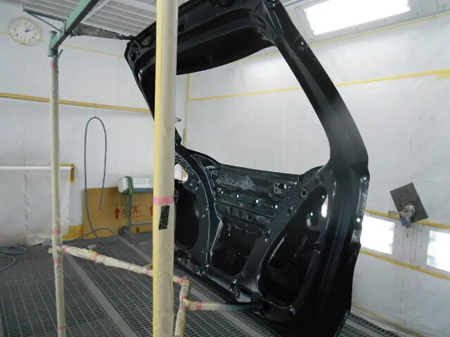 工場の一角で、バックドアが丁寧に塗装されている様子が写っています。