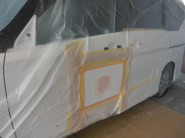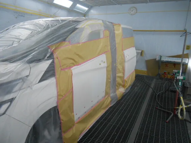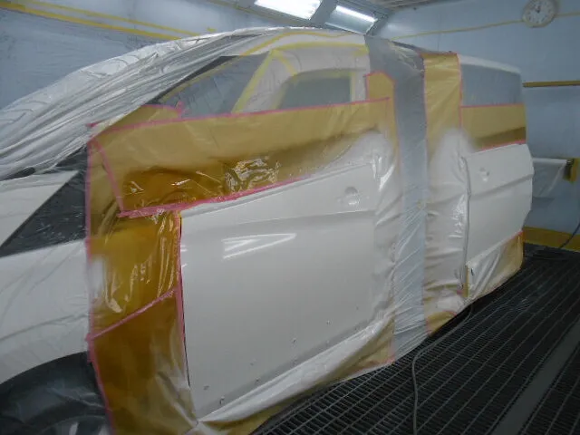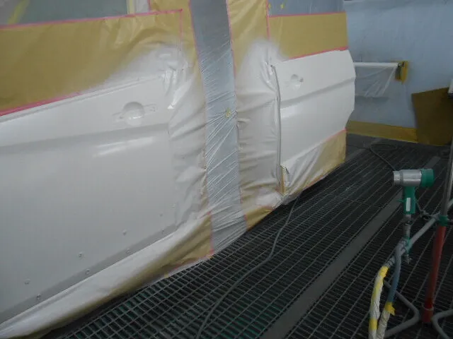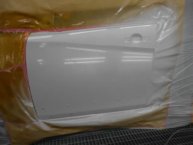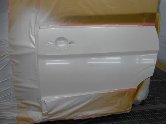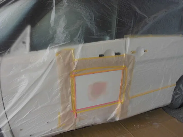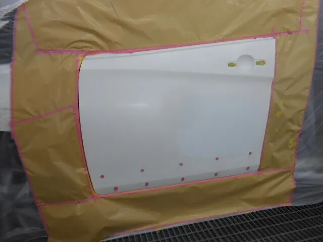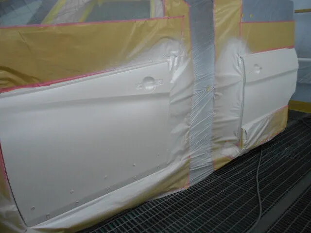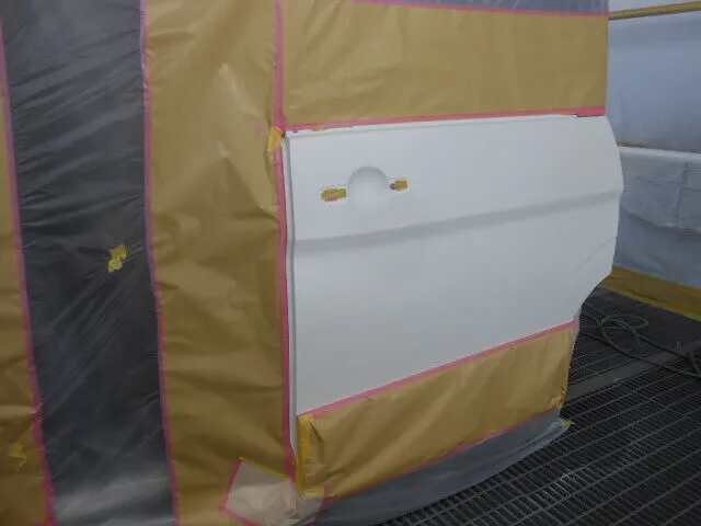 塗装ブースで丁寧にマスキングされた車のドアが、静かに仕上げを待っています。