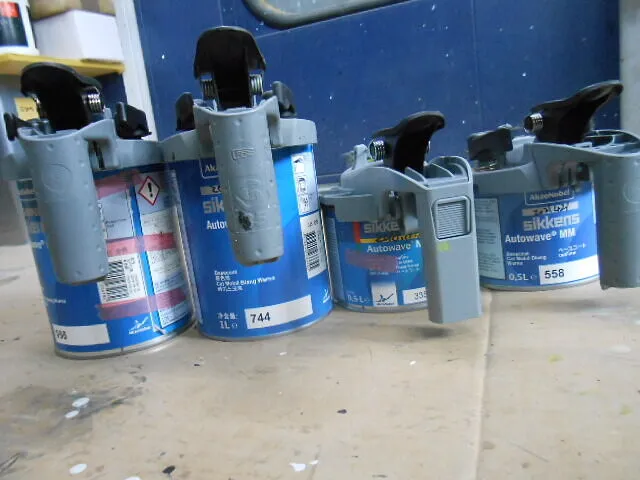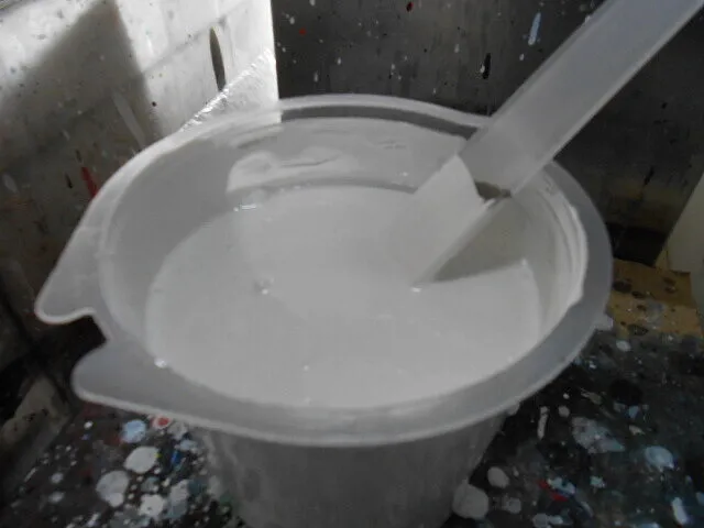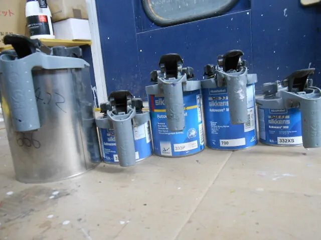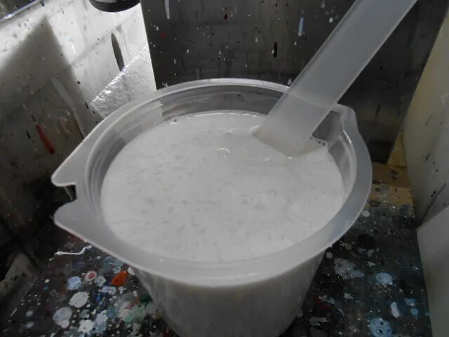 作業場の一角で、塗料を丁寧に混ぜている様子が伝わってきます。