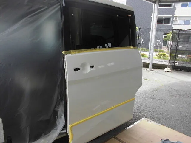 富士市 鈑金塗装 ホンダ N BOX 左リヤドア交換、アウトサイドパネルキズ修理塗装