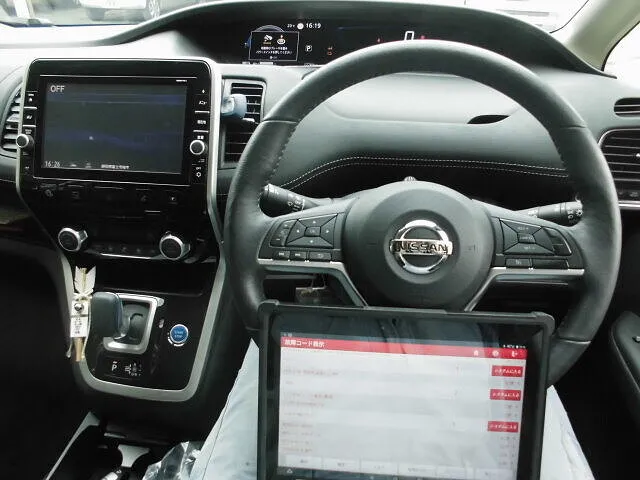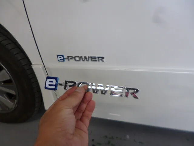 車体の横で、e-POWERエンブレムを手に持つこの瞬間は、