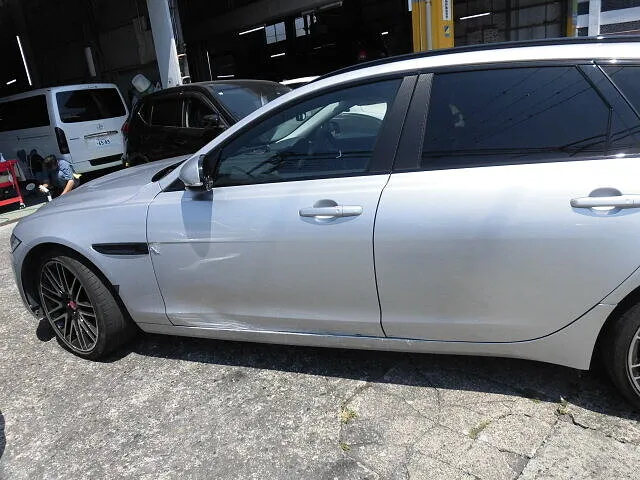 富士市 鈑金塗装 ジャガー 左フロントドア交換、リヤドア鈑金塗装、サイドスポイラー交換塗装修理
