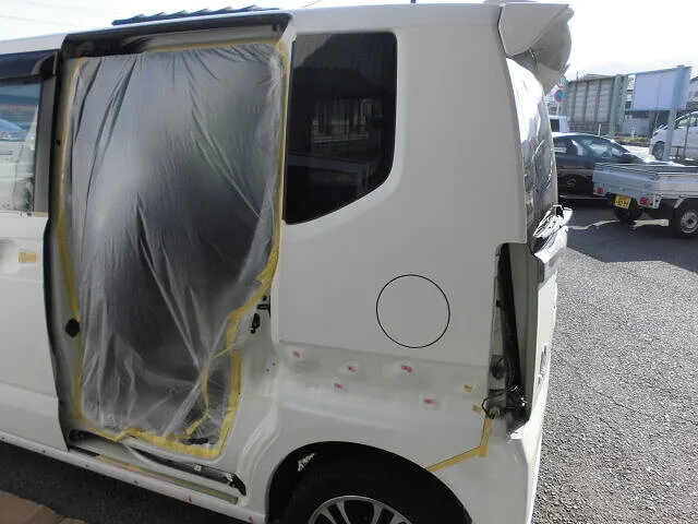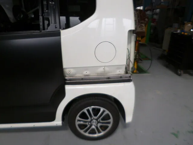 富士市 鈑金塗装 ホンダ N BOX 左リヤドア交換、アウトサイドパネルキズ修理塗装