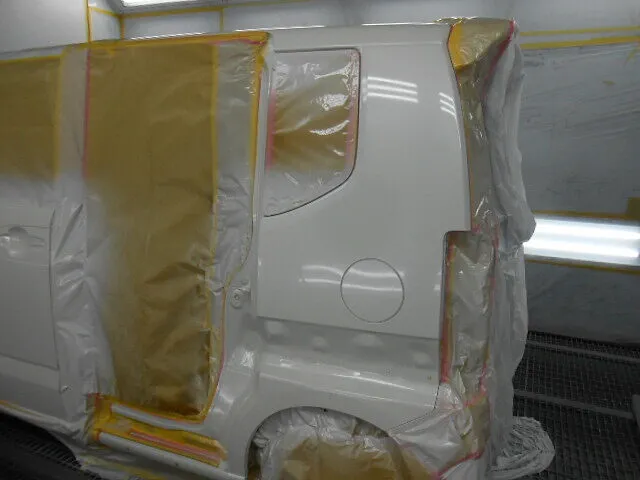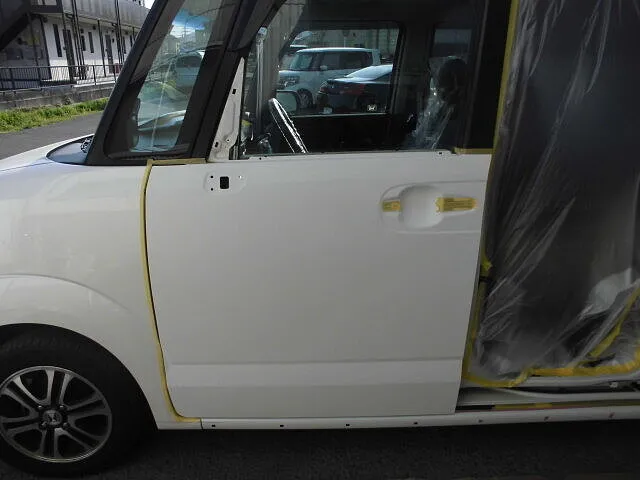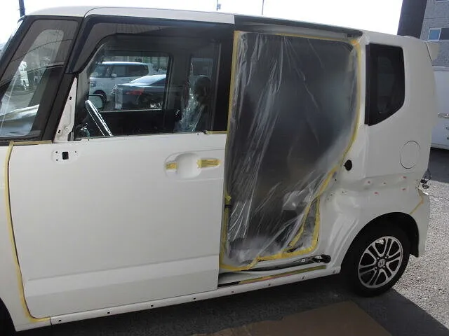 ホンダN BOXの左リヤドアがしっかりと養生されている様子から、