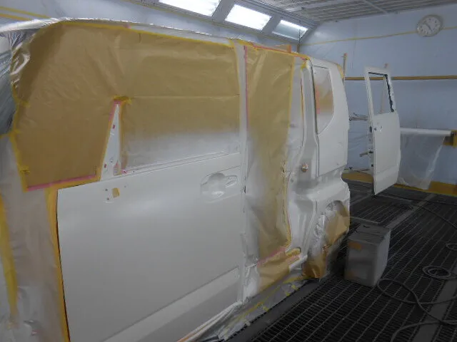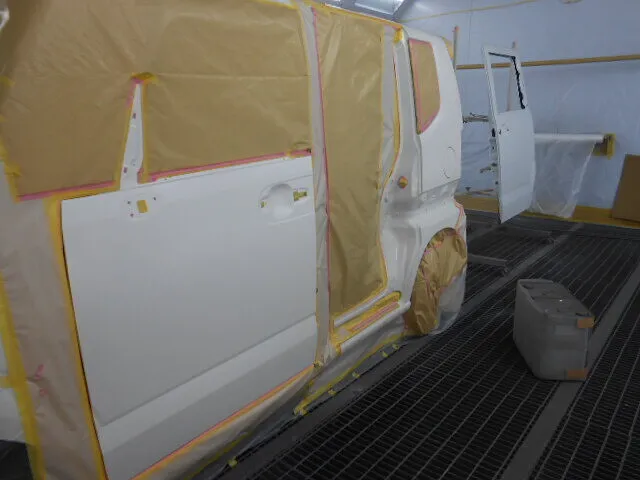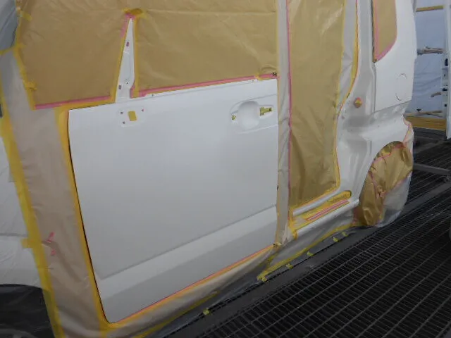 作業場に並ぶホンダN BOXのボディとドア、丁寧にマスキングされた様子が