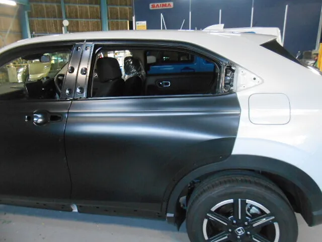 富士市 鈑金塗装 フィットの左フロント、リヤドア交換