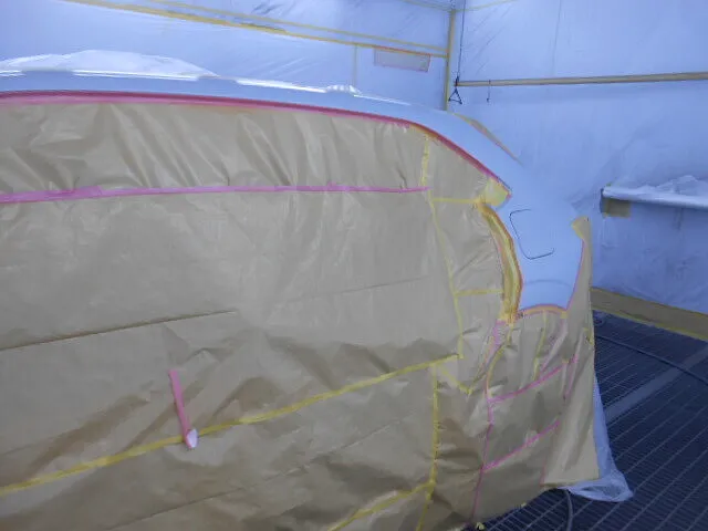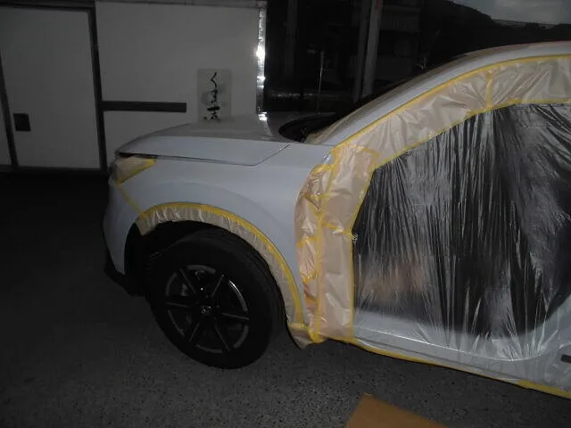 作業場の一角で、マスキングされた車体が静かに佇んでいます。普段は何気なく使っている愛車も、こうして手を加えることで
