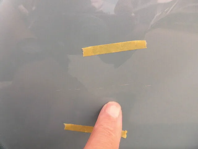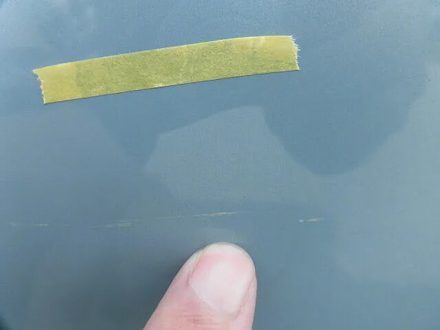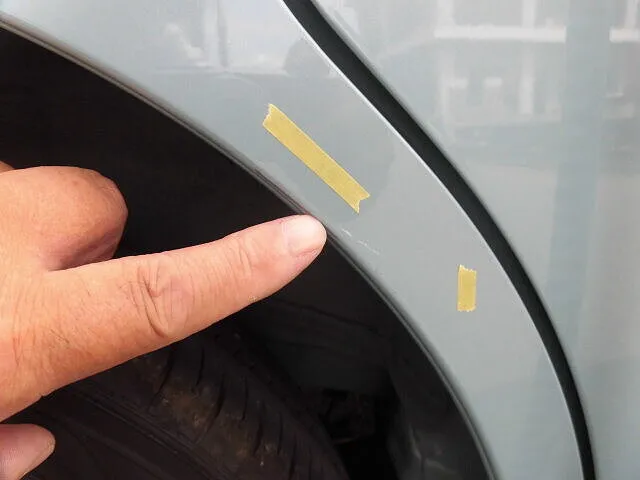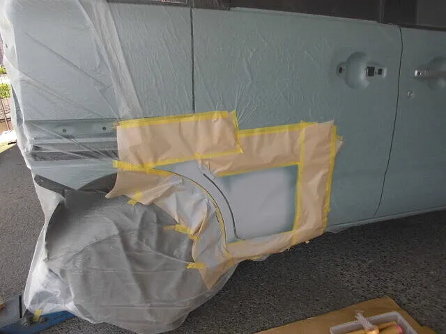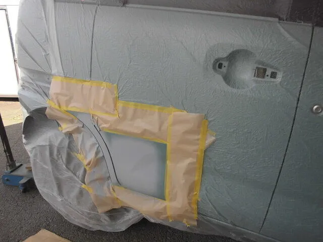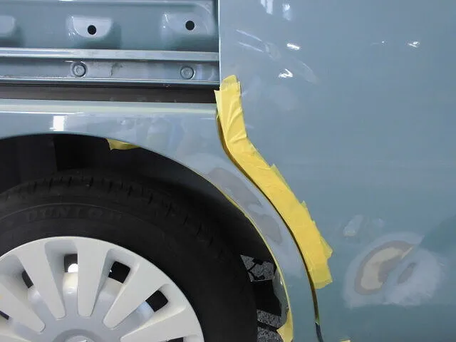 マスキングされた車体の一部が写っています。日常でついぶつけてしまったり、気づかないうちにできた小さなキズも、こうして丁寧に下処理を行いながら修理しています。